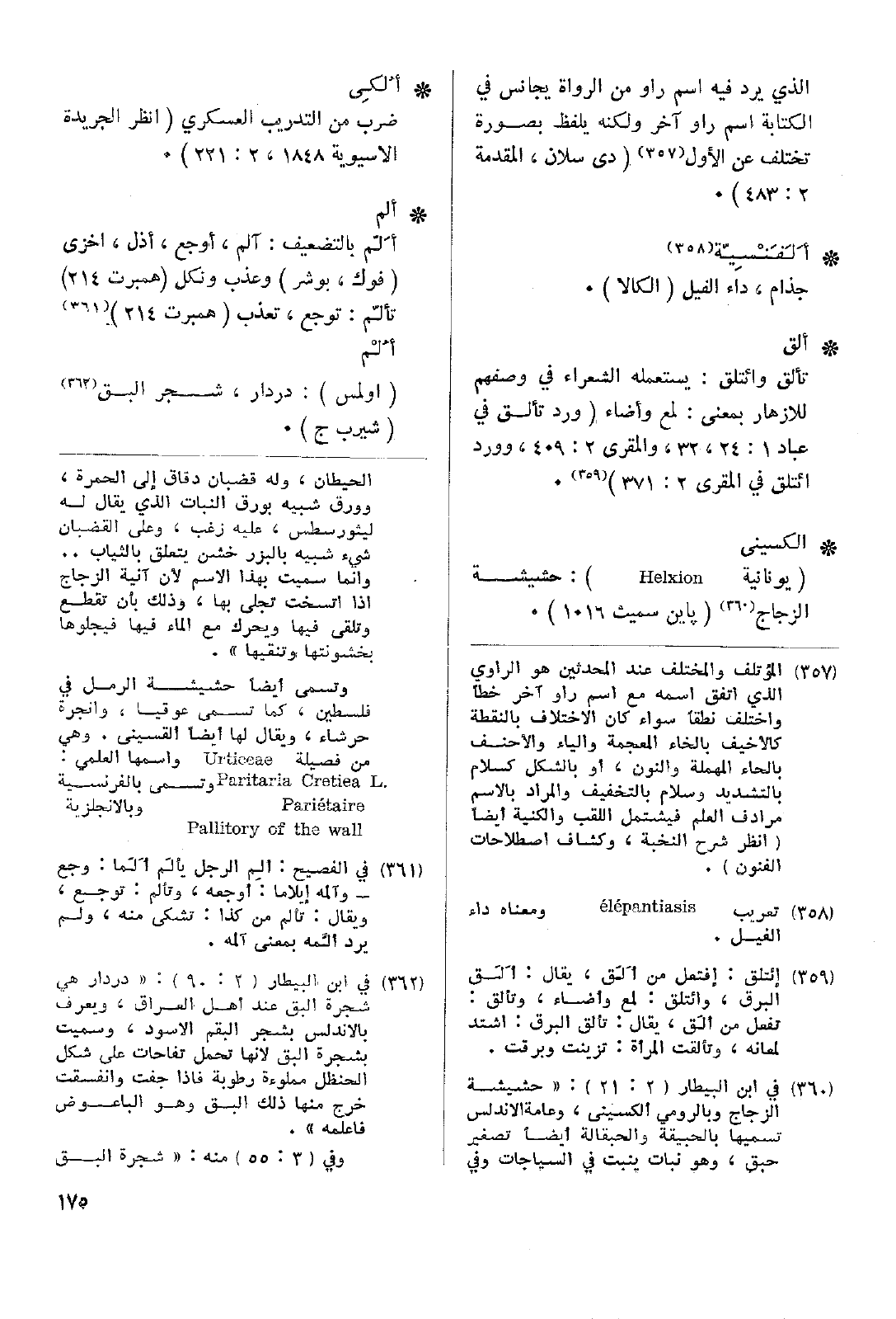 • ألم: أَلّم بالتضعيف: آلم، أوجع، أذل، أخزى (فوك، بوشر) وعذب ونكل (همبرت 214) تألّم: توجع، تعذب (همبرت 214) أُلْم.