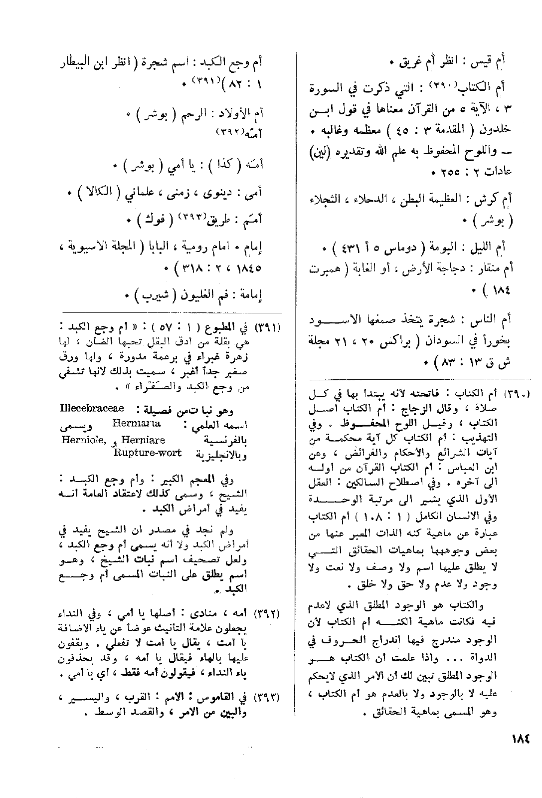 أم الكتاب: التي ذكرت في السورة 3، الآية 5 من القرآن معناها في قول ابن خلدون (المقدمة 3: 45) معظمه وغالبه.