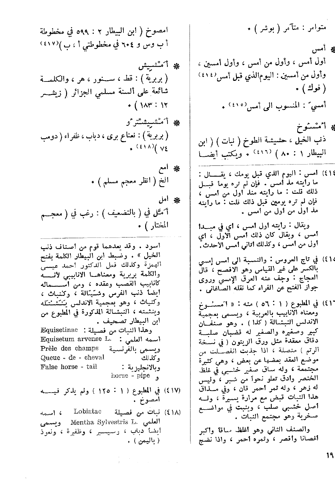 • أُمْسُوخ: ذنب الخيل، حشيشة الطوخ (نبات) (ابن البيطار 1: 80). ويكتب أيضاً امصوخ (ابن البيطار 2: 599 في مخطوطة أب وس و604 في مخطوطتي أ، ب).