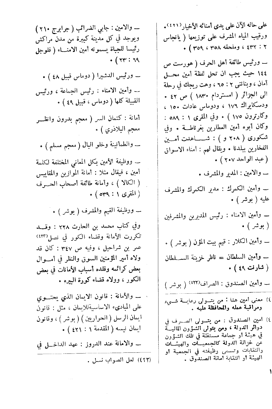ورئيس طائفة أهل الحرف (هورست ص144 حيث يجب أن تحل لفظة أمين محل أمان، وبنانتي 2: 65، وهت ريجك في رحلة إلى الجزائر (امستردام 1830) ص42. ودسكايراك 176، ودوماس عادات 150، وكارترون 175). وفي المقري 1: 589: وكان أبوه أمين العطارين بغرناطة. وفي شكوري (208و): شاهدت أمين الفخارين ببلدنا. ويقال لهم: أمناء الأسواق (عبد الواحد 207).