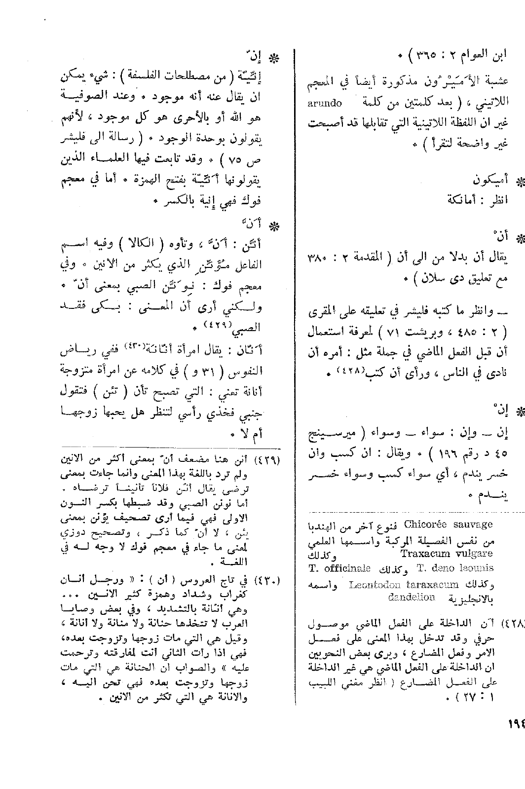 • أنّ: إنِّيّة (من مصطلحات الفلسفة): شيء يمكن أن يقال عنه إنه موجود. وعند الصوفية هو الله أو بالأحرى هو كل موجود، لأنهم يقولون بوحدة الوجود. (رسالة إلى فليشر ص75). وقد تابعت فيها العلماء الذين يقولونها أَنِّيّة بفتح الهمزة. أما في معجم فوك فهي إِنية بالكسر.