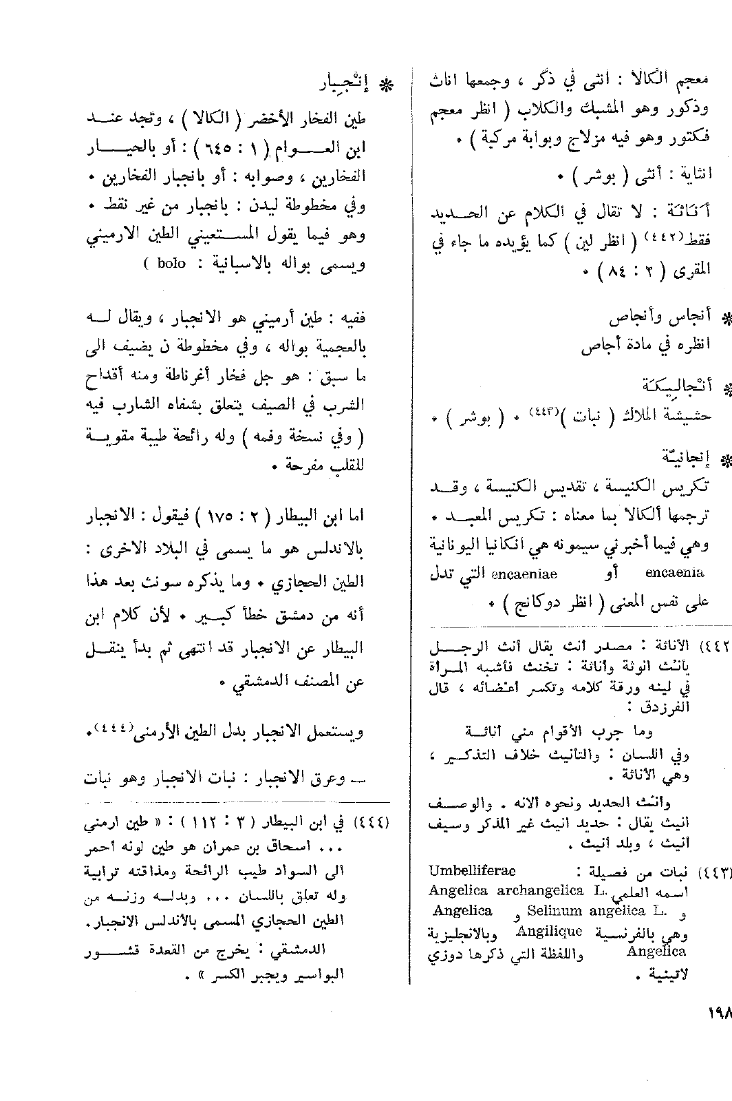 • إنْجِبار: طين الفخار الأخضر (الكالا)، وتجد عند ابن العوام (1: 645): أو بالحيار الفخارين، وصوابه: أو بانجبار الفخارين. وفي مخطوطة ليدن: بانجبار من غير نقط. وهو فيما يقول المستعيني الطين الأرميني ويسمى بواله بالأسبانية: bolo) .