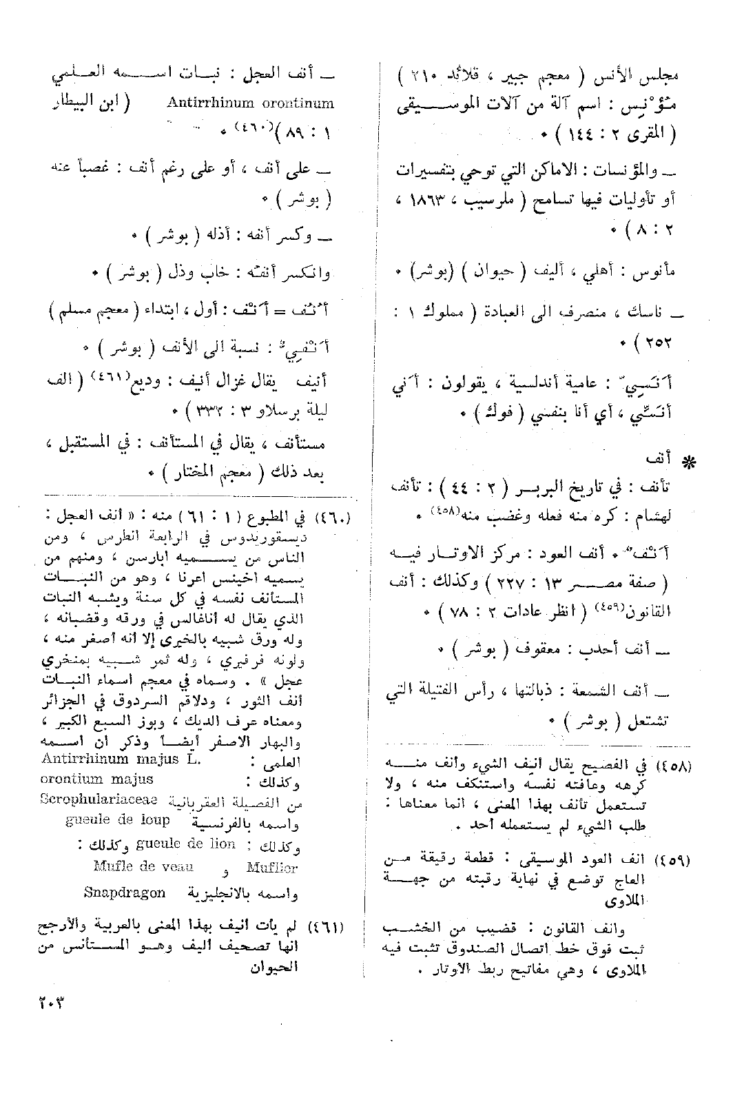 أنف العجل: نبات اسمه العلمي Antirrhonum orontinum ( ابن البيطار 1: 89).