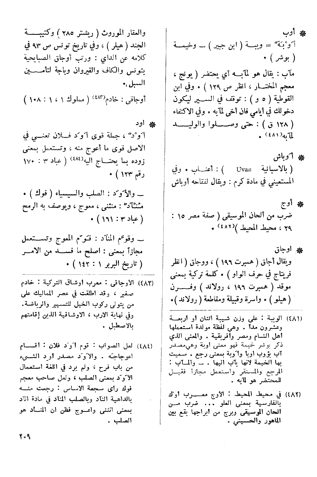 • اود: أَوْدٌ، جملة قوى أَوَد فلان تعني في الأصل قوى ما أعوج منه، وتستعمل بمعنى زوده بما يحتاج إليه (عباد 3: 170 رقم 123).