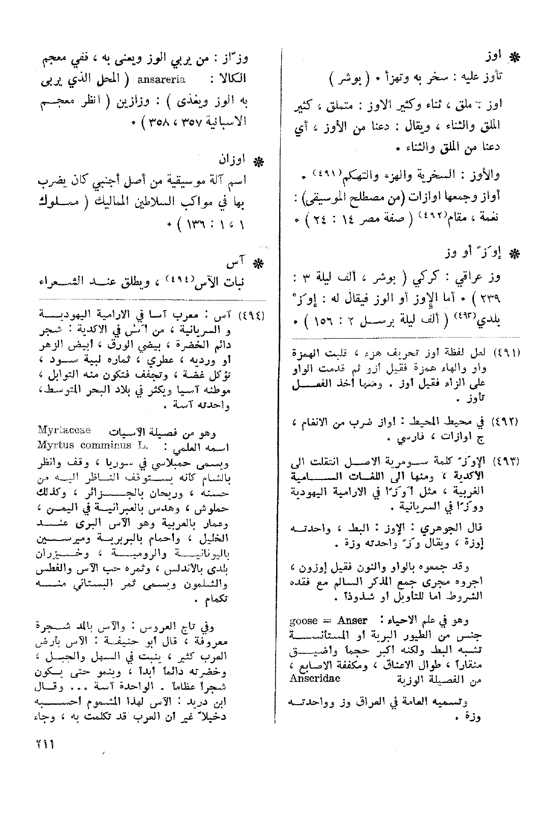 • إوَزّ أو وز: وز عراقي: كركي (بوشر، ألف ليلة 3: 239). أما الإِوز أو الوز فيقال له: إوَزْ بلدي (ألف ليلة برسل 2: 156).