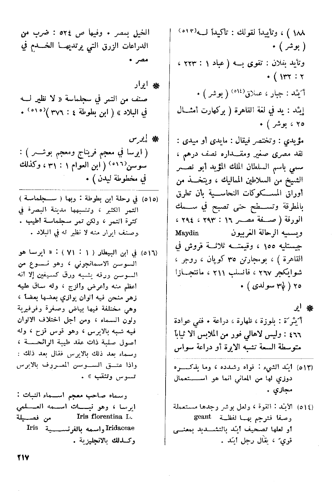 • أيرِس: (ايرسا في معجم فريتاج ومعجم بوشر): سوسن (ابن العوام 1: 31، وكذلك في مخطوطة ليدن).