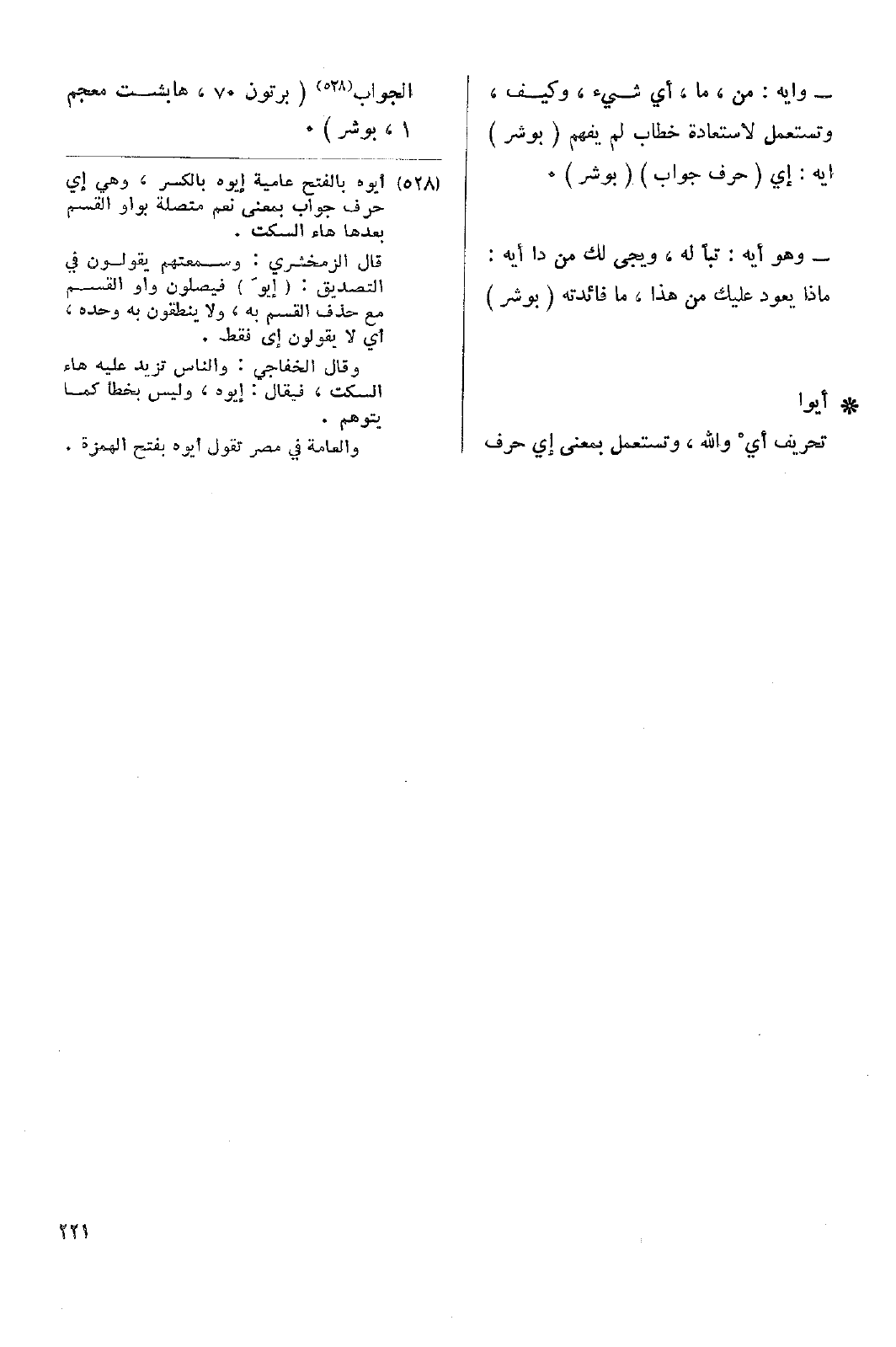 • أيوا: تحريف أيْ والله، وتستعمل بمعنى إي حرف الجواب (برتون 70، هابشت معجم 1، بوشر).