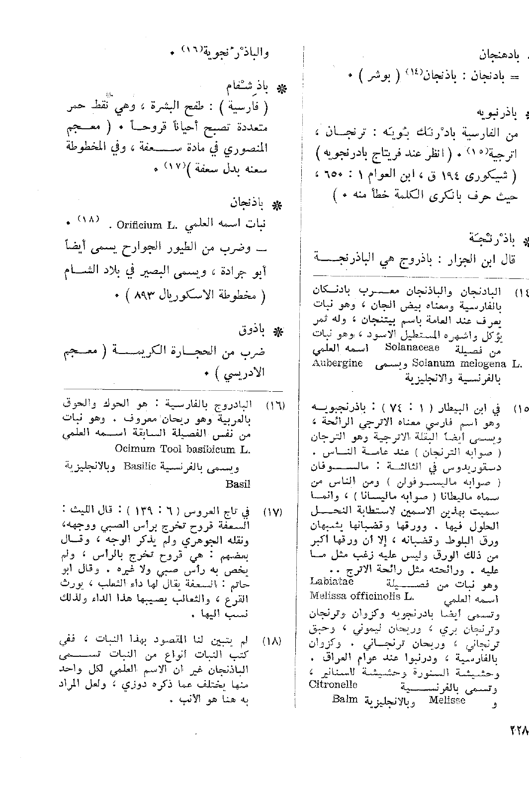 • باذرنبويه: من الفارسية بادْرنَك بُويَه: ترنجان، اترجية. (انظر عند فريتاج بادرنجويه) (شيكورى 194ق، ابن العوان 1: 650، حيث حرف بانكري الكلمة خطأ منه.)