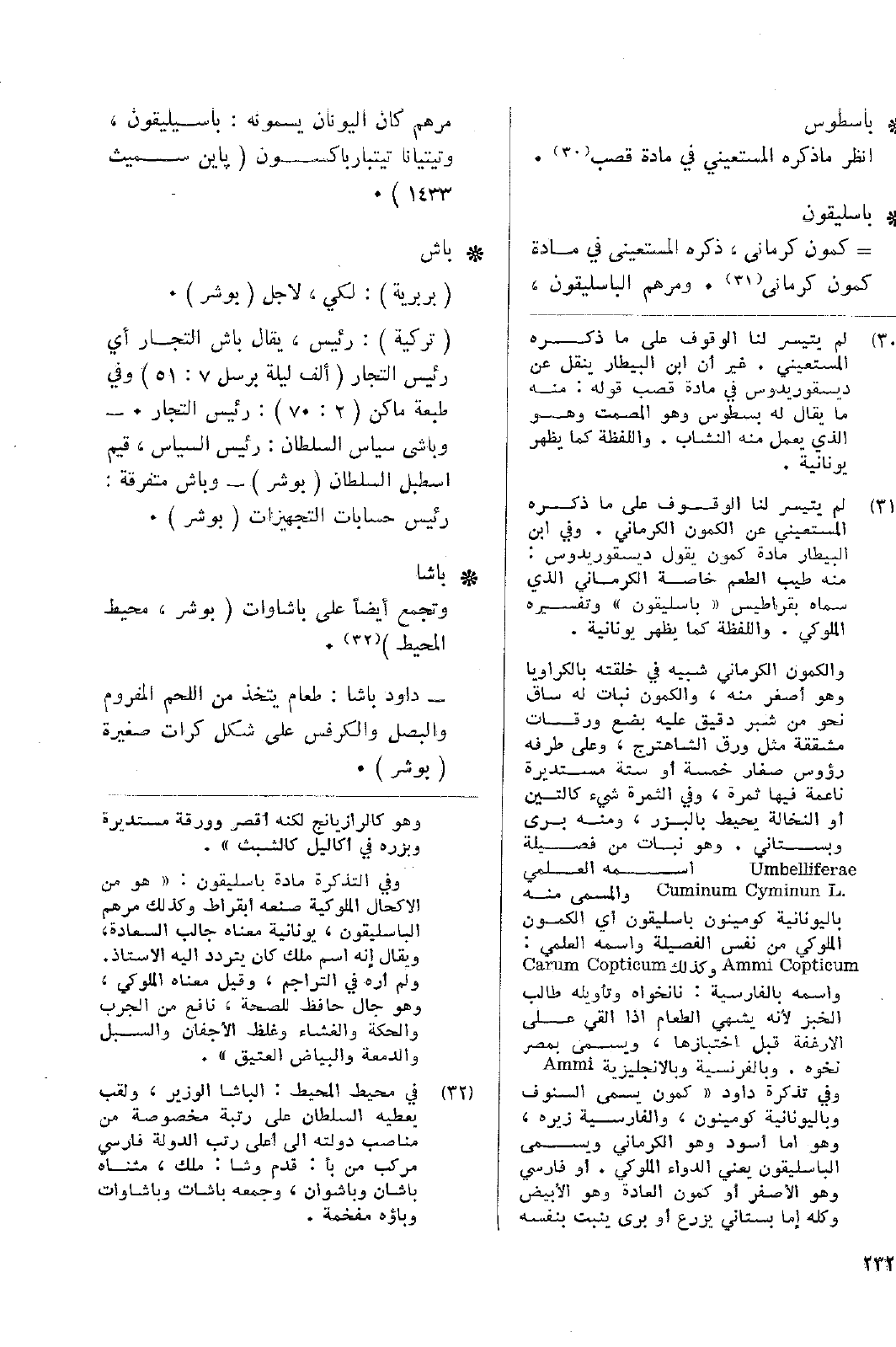 • باسليقون: = كمون كرماني، ذكره المستعيني في مادة كمون كرماني. ومرهم الباسليقون، مرهم كان اليونان يسمونه: باسيليقون، وتيتيانا تيتبارباكسون (باين سميث 1433).