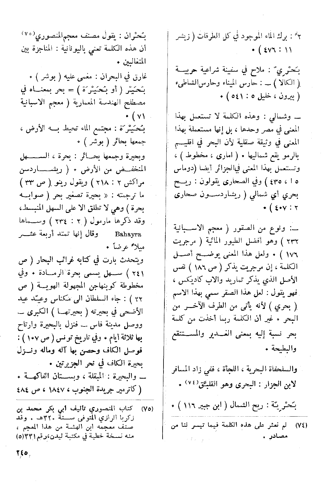 بُحَيْر (أو بُحَيْرَة) = بحر بمعناه في مصطلح الهندسة المعمارية (معجم الأسبانية 71) بُحَيْرَة: مجتمع الماء تحيط به الأرض، جمعها بحائر (بوشر).