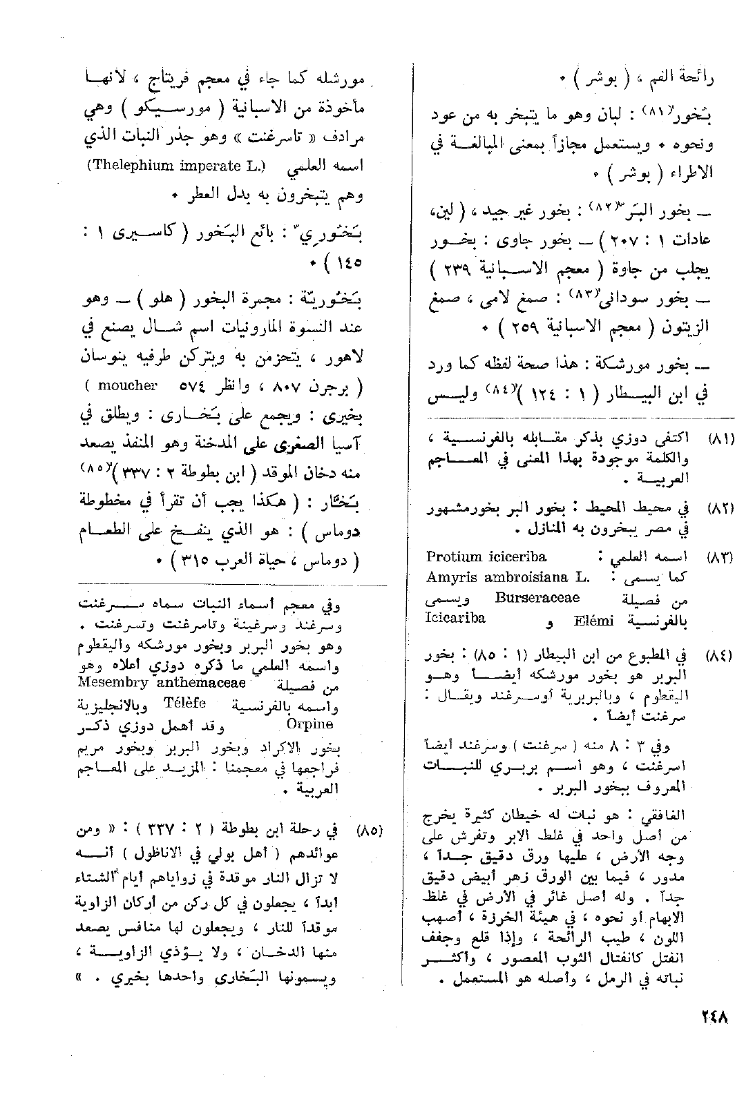 بخور مورشكة: هذا صحة لفظه كما ورد في ابن البيطار (1: 124) وليس مورشله كما جاء في معجم فريتاج، لانها مأخوذة من الأسبانية (مورسيكو) وهي مرادف ((تاسرغنت)) وهو جذر النبات الذي اسمه العلمي ( Thelephium imperate L.) وهم يتبخرون به بدل العطر.