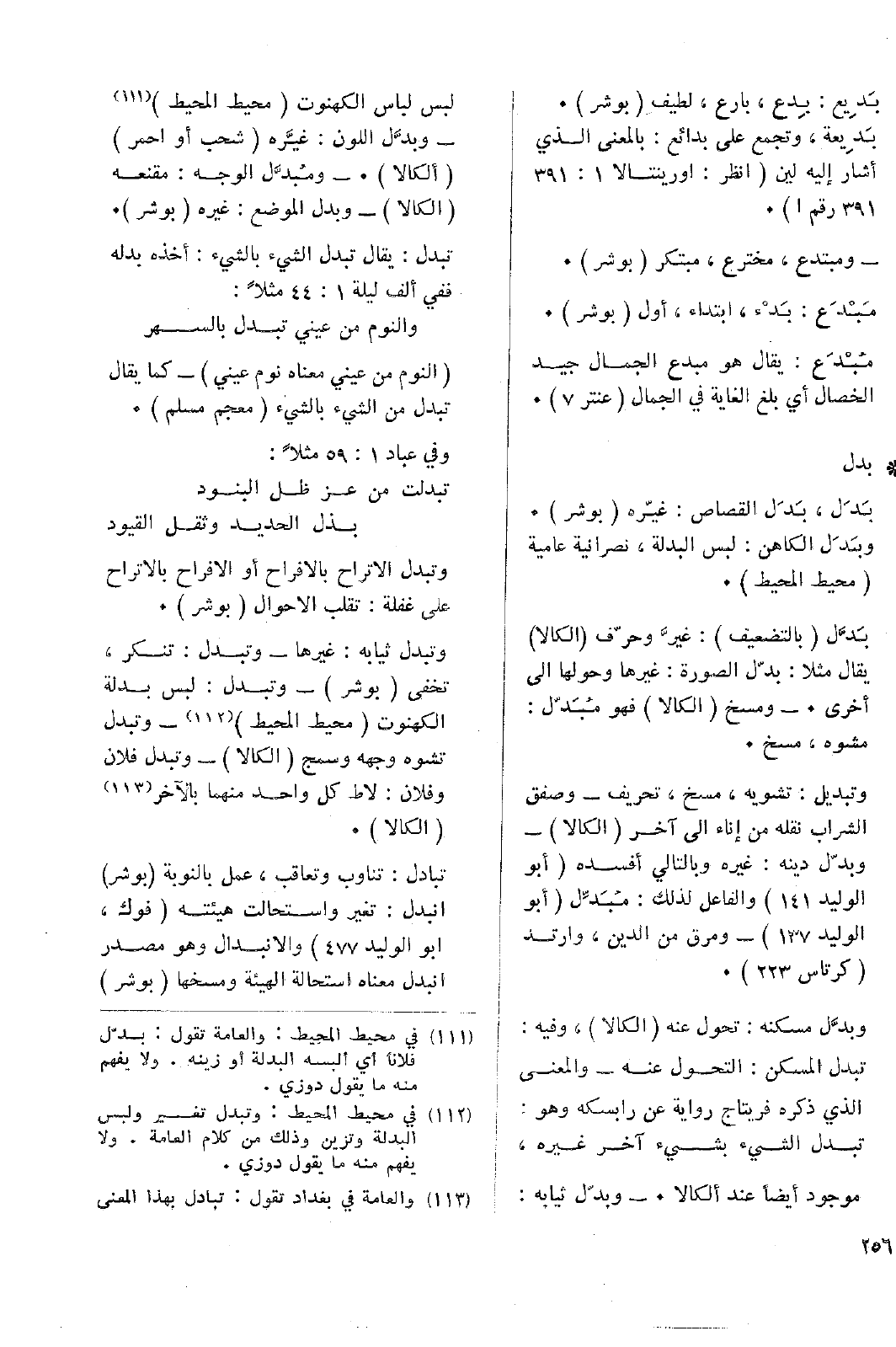 وبدَّل مسكنه: تحول عنه (الكالا)، وفيه: تبدل المسكن: التحول عنه - والمعنى الذي ذكره فريتاج رواية عن رابسكه وهو: تبدل الشيء بشيء آخر غيره، موجود أيضاً عند ألكالا. - وبدّل ثيابه: لبس لباس الكهنوت (محيط المحيط) - وبدَّل اللون: غيَّره (شحب أو احمر) (ألكالا). - ومُبدَّل الوجه: مقنعه (الكالا) - وبدل الموضع: غيره (بوشر).