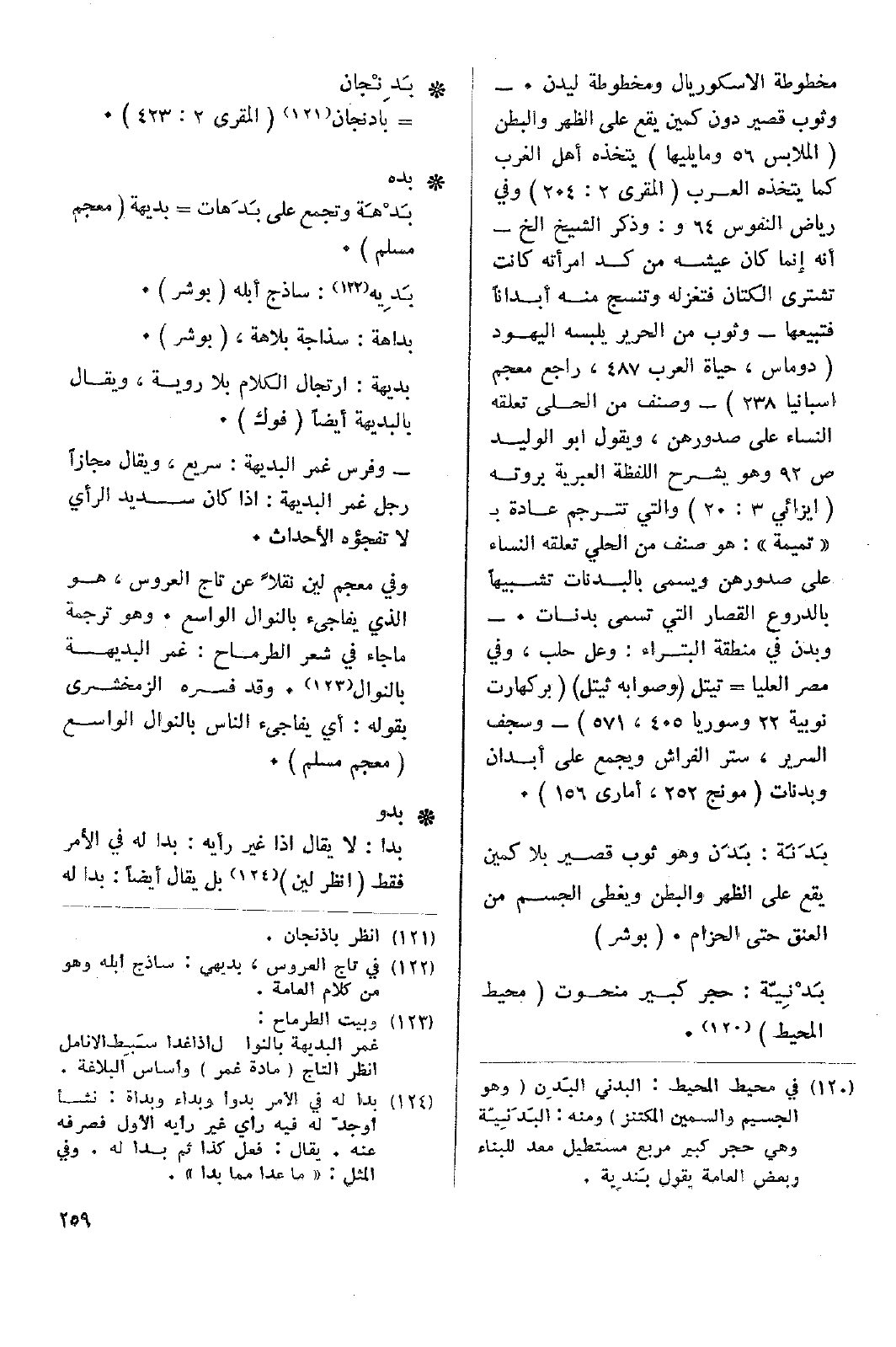مخطوطة الاسكوريال ومخطوطة ليدن. - وثوب قصير دون كمين يقع على الظهر والبطن (الملابس 56 وما يليها) يتخذه أهل الغرب كما يتخذه العرب (المقري 2: 204) وفي رياض النفوس 64و: وذكر الشيخ الخ - إنه إنما كان عيشه من كد امرأته كانت تشتري الكتان فتغزله وتنسج منه أبداناً فتبيعها - وثوب من الحرير يلبسه اليهود (دوماس، حياة العرب 487، راجع معجم أسبانيا 238) - وصنف من الحلي تعلقه النساء على صدورهن، ويقول أبو الوليد ص92 وهو يشرح اللفظة العبرية بروته (ايزائي 3: 20) والتي تترجم عادة ب ((تميمة)): هو صنف من الحلي تعلقه النساء على صدورهن ويسمى بالبدنات تشبيهاً بالدروع القصار التي تسمى بدنات. - وبدن في منطقة البتراء: وعل حلب، وفي مصر العليا = تيتل (وصوابه ثيتل) (بركهارت نوبية 22 وسوريا 405، 571) - وسجف السرير، ستر الفراش ويجمع على أبدان وبدنات (مونج 252، أماري 156).