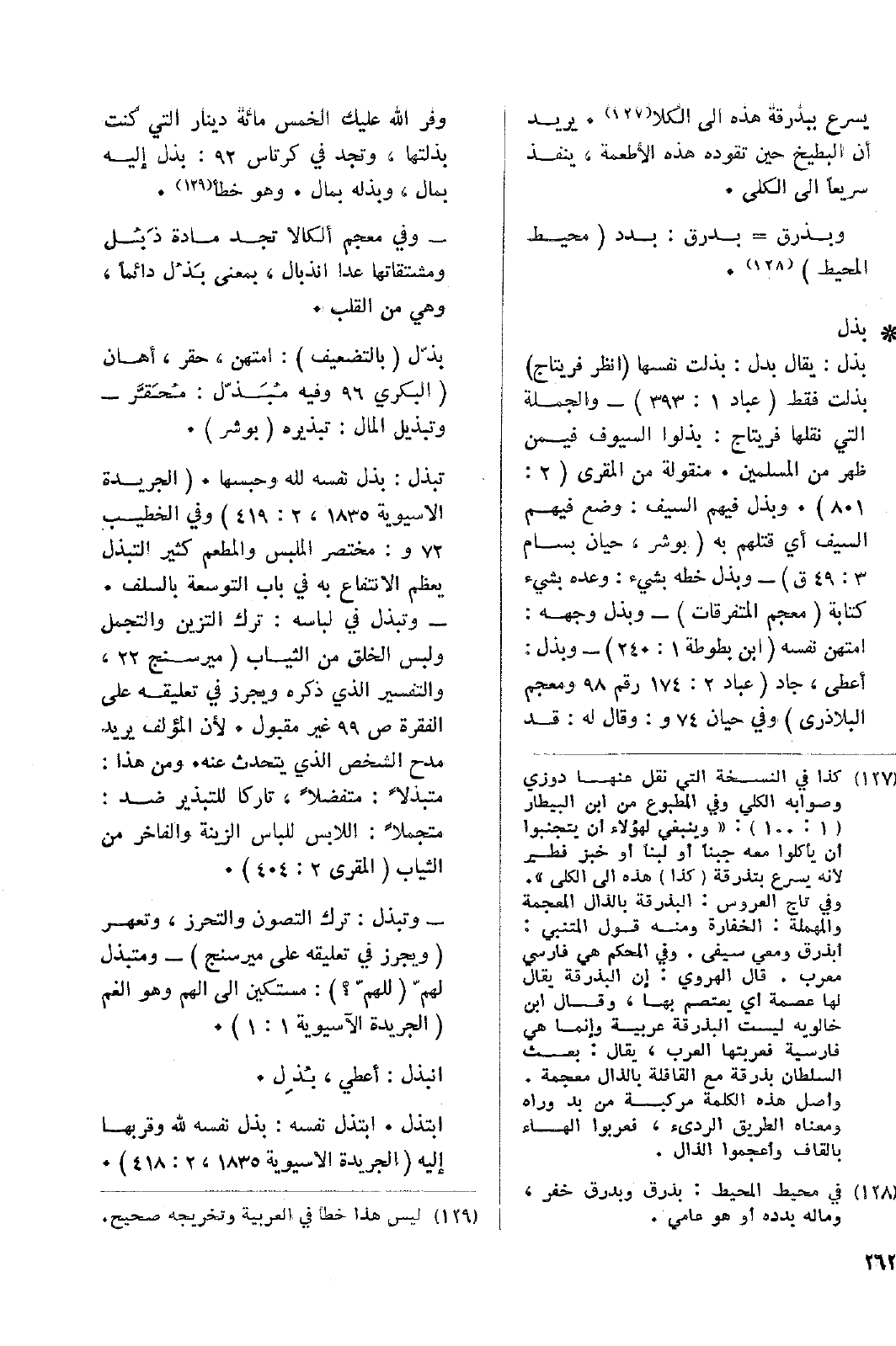 • بذل: يقال بدل: بذلت نفسها (انظر فريتاج) بذلت فقط (عباد 1: 393) - والجملة التي نقلها فريتاج: بذلوا السيوف فيمن ظهر من المسلمين. منقولة من المقري (2: 801). وبذل فيهم السيف: وضع فيهم السيف أي قتلهم به (بوشر، حيان بسام 3: 49ق) - وبذل خطه بشيء: وعده بشيء كتابة (معجم المتفرقات) - وبذل وجهه: امتهن نفسه (ابن بطوطة 1: 240) - وبذل: أعطى، جاد (عباد 2: 174 رقم 98 ومعجم البلاذري) وفي حيان 74و: وقال له: قد وفر الله عليك الخمس مائة دينار التي كنت بذلتها، وتجد في كرتاس 92: بذل إليه بمال، وبذله بمال. وهو خطأ.