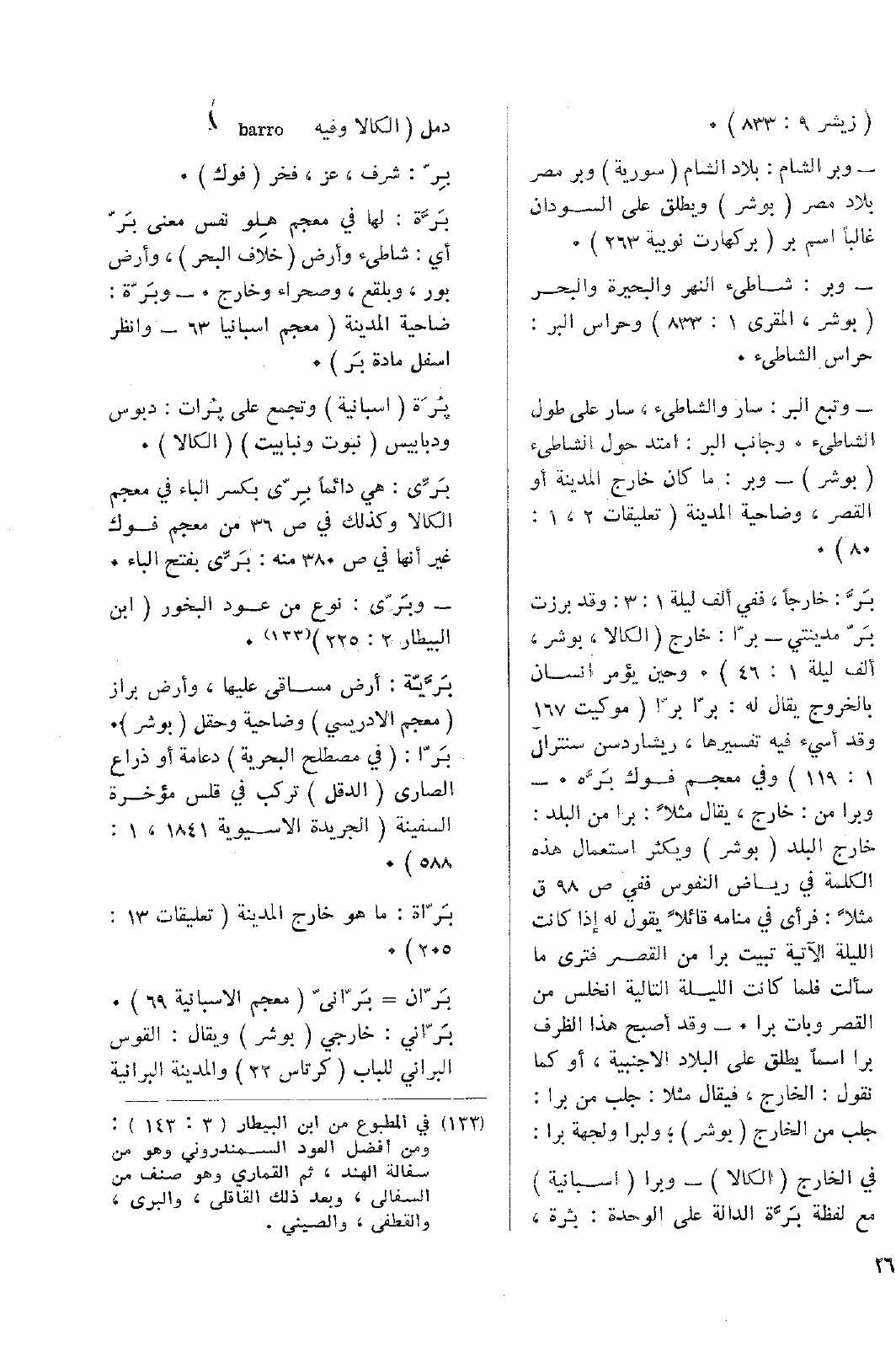 بَرَّة: لها في معجم هِلو نفس معنى بَرّ أي: شاطئ وأرض (خلاف البحر)، وأرض بور، وبلقع، وصحراء وخارج. - وبَرّة: ضاحية المدينة (معجم أسبانيا 63 - وانظر اسفل مادة بَر).