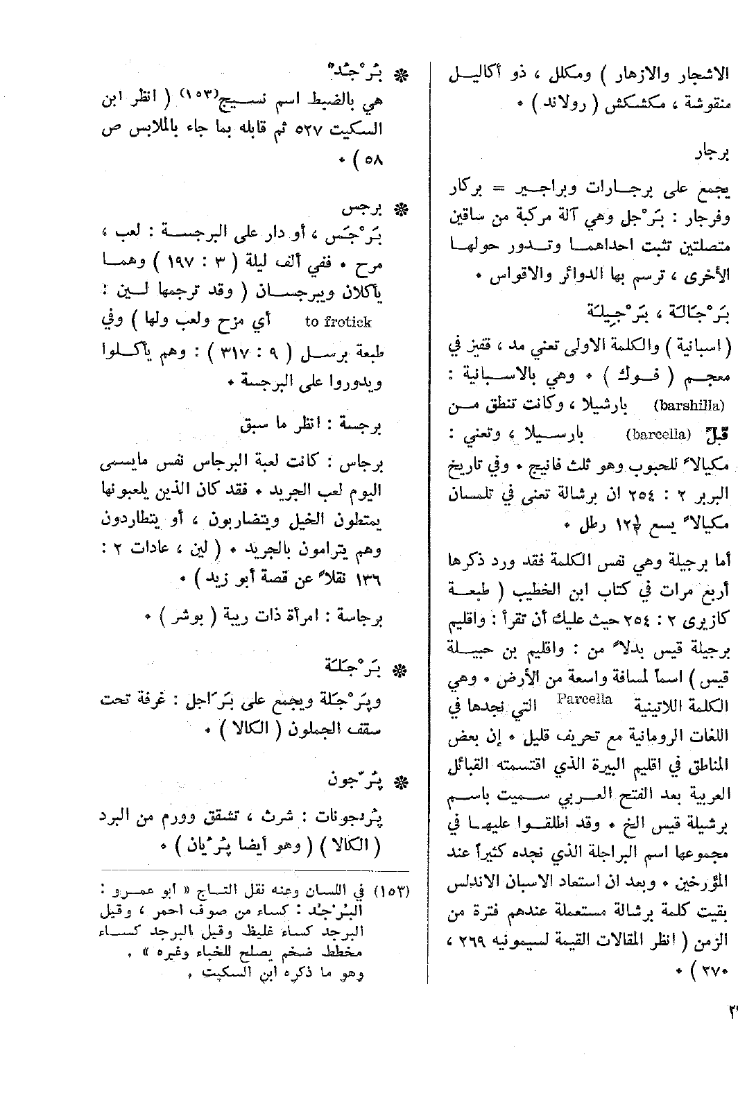 أما برجيلة وهي نفس الكلمة فقد ورد ذكرها أربع مرات في كتاب ابن الخطيب (طبعة كازيري 2: 254 حيث عليك أن تقرأ: وإقليم برجيلة قيس بدلاً من: وإقليم بن حبيلة قيس) اسماً لمسافة واسعة من الأرض. وهي الكلمة اللاتينية Parcella التي نجدها في اللغات الرومانية مع تحريف قليل. إن بعض المناطق في إقليم البيرة الذي اقتسمته القبائل العربية بعد الفتح العربية سميت باسم برشيلة قيس الخ. وقد أطلقوا عليها في مجموعها اسم البراجلة الذي نجده كثيراً عند المؤرخين. وبعد أن استعاد الأسبان الأندلس بقيت كلمة برشالة مستعملة عندهم فترة من الزمن (انظر المقالات القيمة لسيمونيه 269، 270).