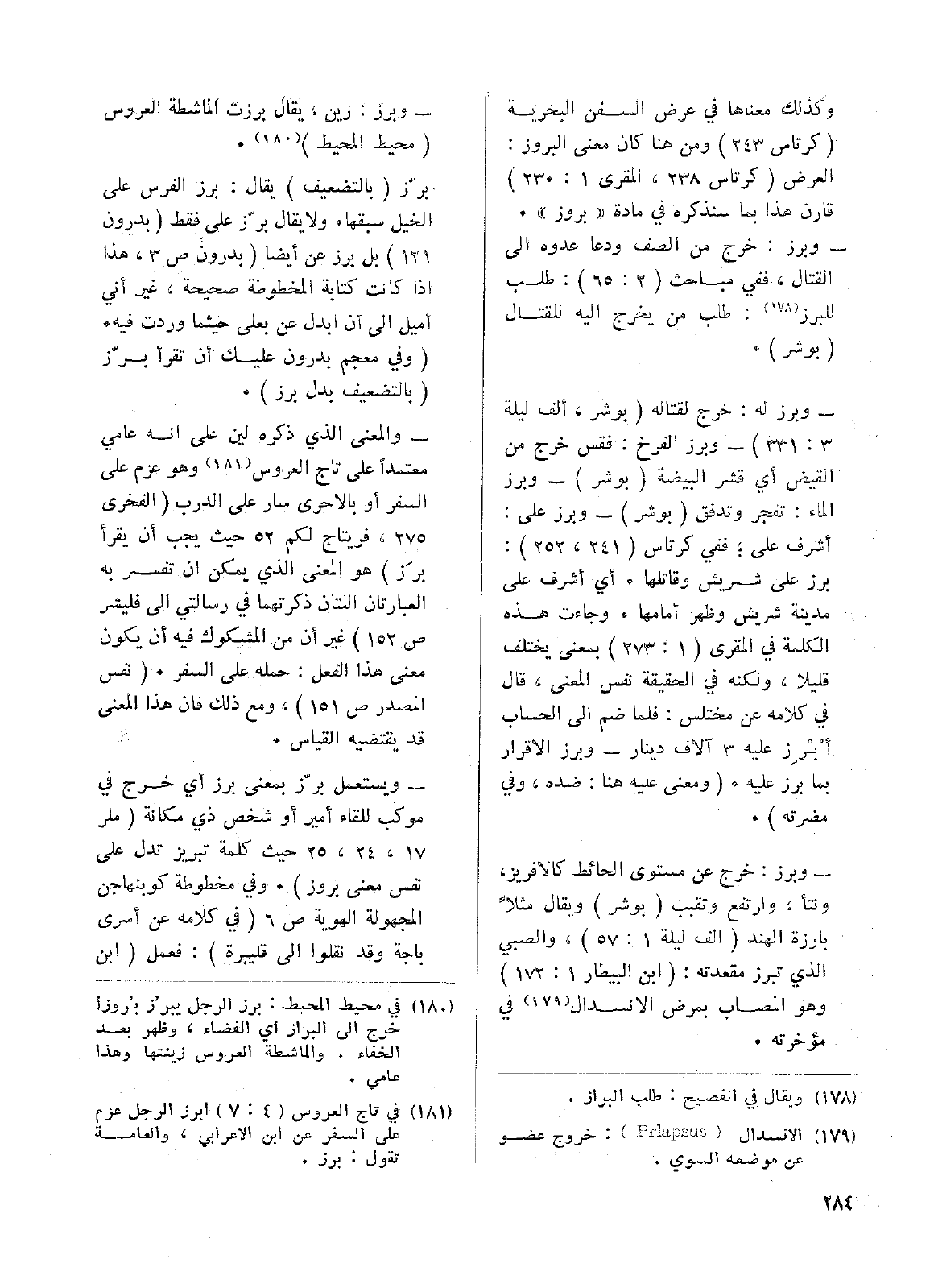 وكذلك معناها في عرض السفن البحرية (كرتاس 243) ومن هنا كان معنى البروز: العرض (كرتاس 238، المقري 1: 230) قارن هذا بما سنذكره في مادة ((بروز)).