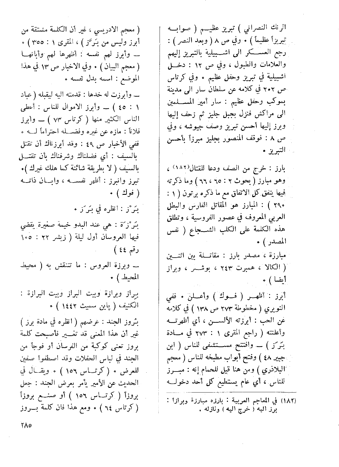 بارز: خرج من الصف ودعا للقتال، وهو مبارز (بحوث 2: 65، 66) وما ذكرته فيها يتفق كل الاتفاق مع ما ذكره برتون (1: 290): المبارز هو المقاتل الفارس والبطل العربي المعروف في عصور الفروسية، وتطلق هذه الكلمة على الكلب الشجاع (نفس المصدر).