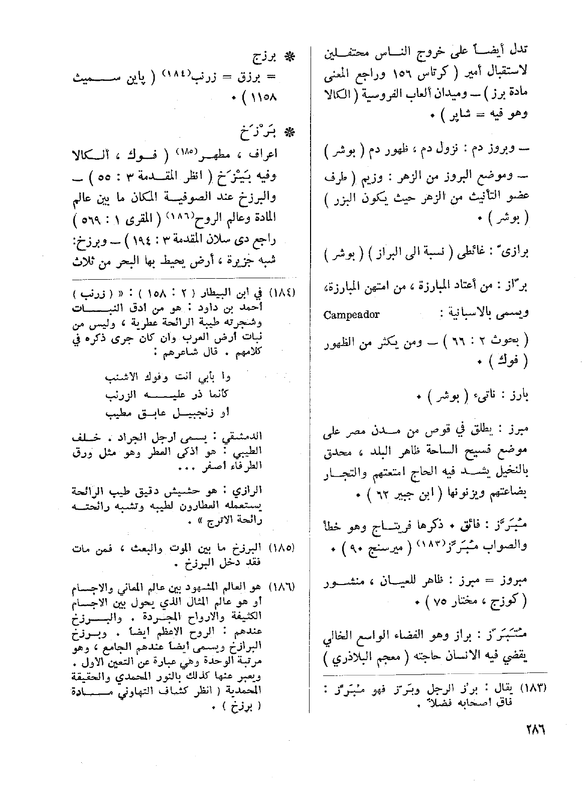 • بَرْزَخ: أعراف، مطهر (فوك، ألكالا وفيه بَيْزَخ (انظر المقدمة 3: 55) - والبرزخ عند الصوفية المكان ما بين عالم المادة وعالم الروح (المقري 1: 569) راجع دى سلان المقدمة 3: 194) - وبرزخ: شبه جزيرة، أرض يحيط بها البحر من ثلاث