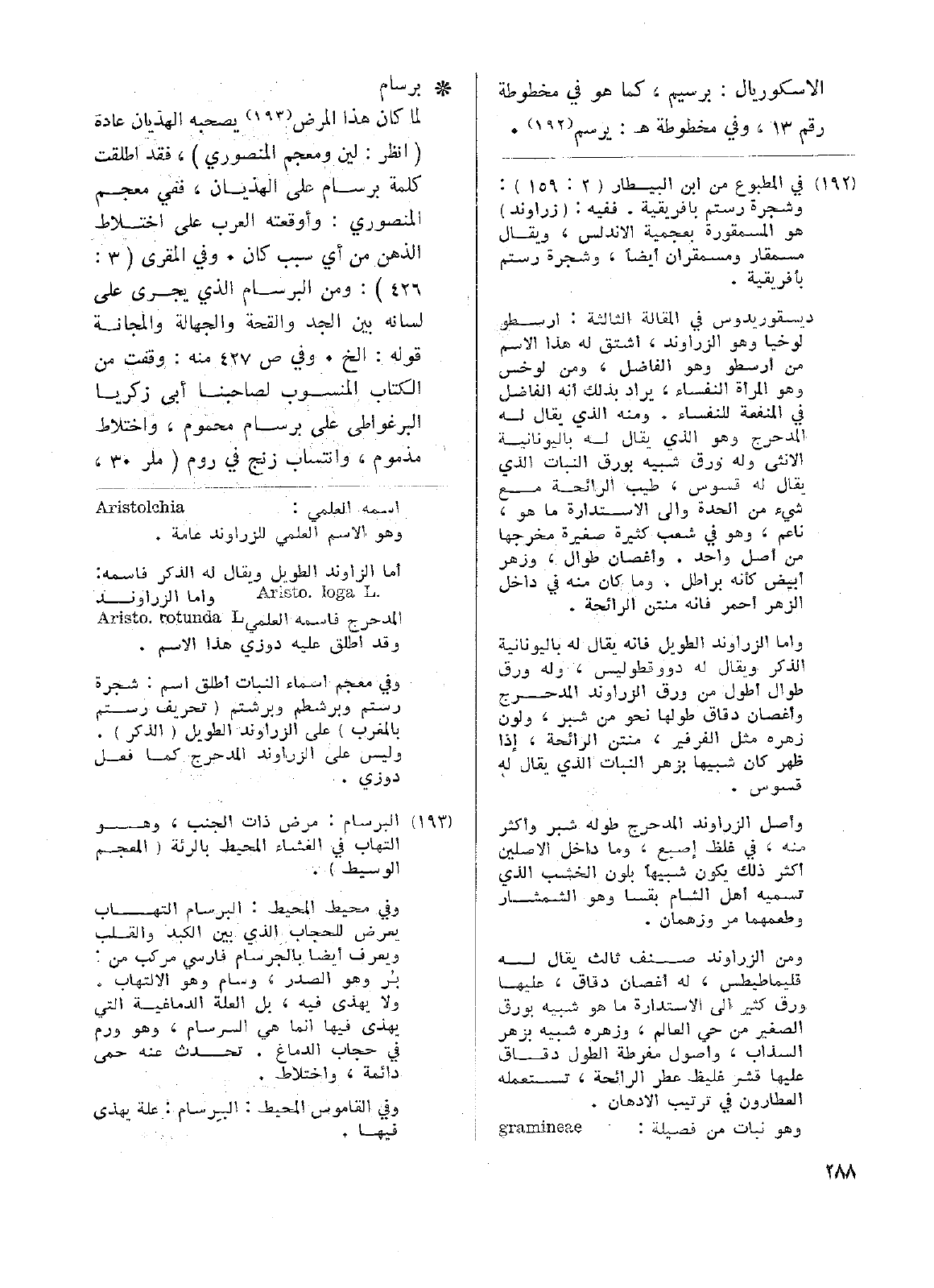 • برسام: لما كان هذا المرض يصحبه الهذيان عادة (انظر: لين ومعجم المنصوري)، فقد اطلقت كلمة برسام على الهذيان، ففي معجم المنصوري: وأوقعته العرب على اختلاط الذهن من أي سبب كان. وفي المقري (3: 426): ومن البرسام الذي يجري على لسانه بين الجد والقحة والجهالة والمجانة قوله: الخ. وفي ص427 منه: وقفت من الكتاب المنسوب لصاحبنا أبي زكريا البرغواطي على برسام محموم، واختلاط مذموم، وانتساب زنج في روم (ملر 30،