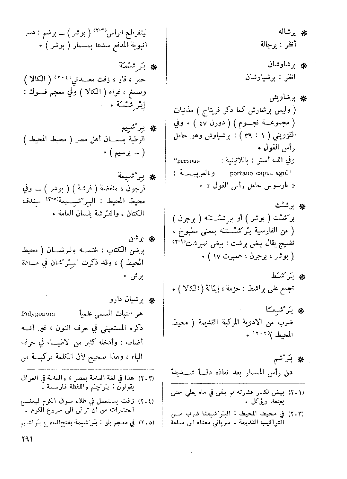 • برشيان دارو: هو النبات المسمى علمياً Polygonum ذكره المستعيني في حرف النون، غير إنه أضاف: وأدخله كثير من الأطباء في حرف الباء، وهذا صحيح لأن الكلمة مركبة من