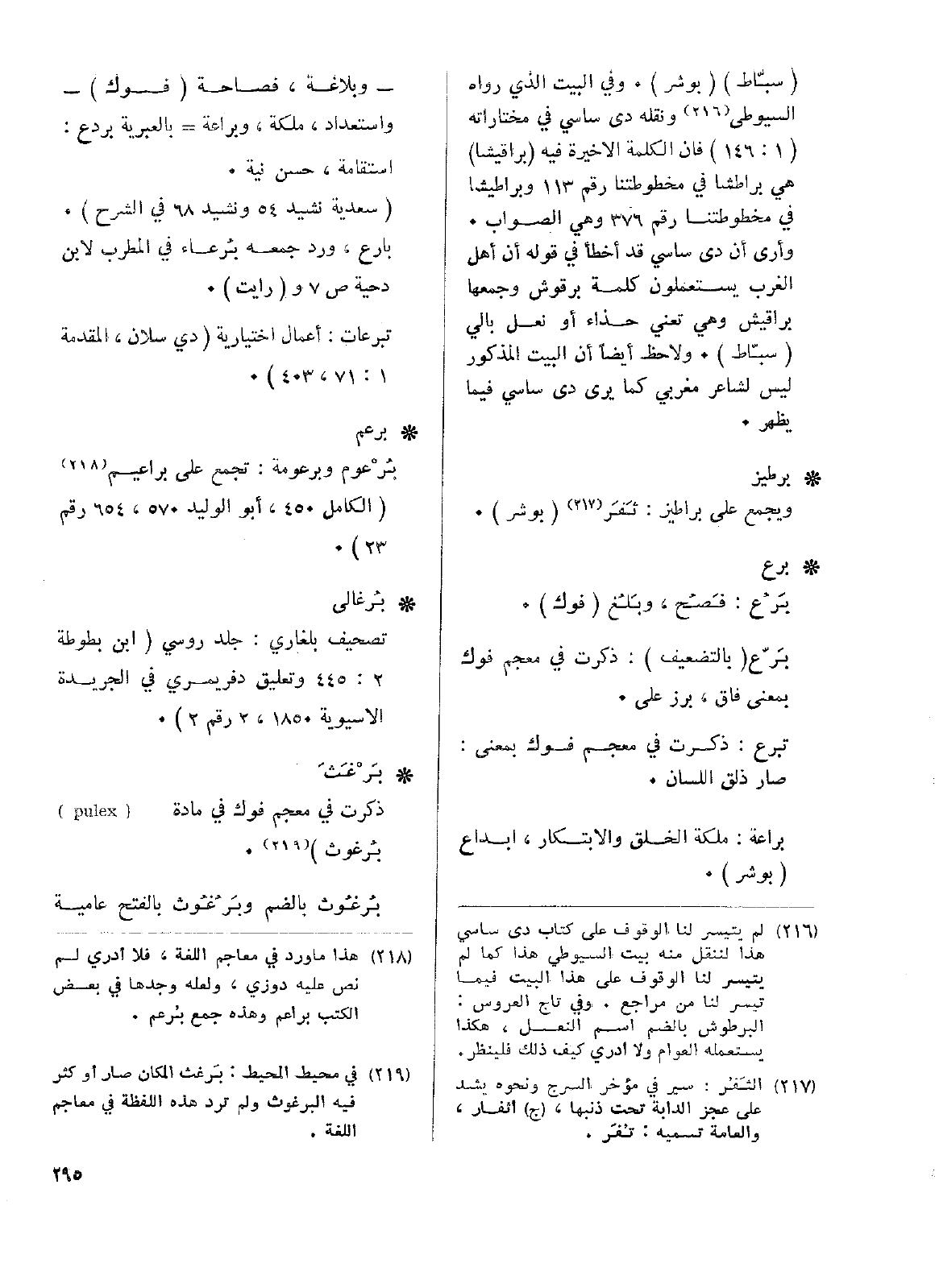 (سبّاط) (بوشر). وفي البيت الذي راوه السيوطي ونقله دى ساسي في مختاراته (1: 146) فإن الكلمة الأخيرة فيه (براقيشا) هي براطشا في مخطوطتنا رقم 113 وبراطيشا في مخطوطتنا رقم 376 وهي الصواب. وأرى أن دى ساسي قد أخطأ في قوله أن أهل الغرب يستعملون كلمة برقوش وجمعها براقيش وهي تعني حذاء أو نعل بالي (سبّاط). ولاحظ أيضاً أن البيت المذكور ليس لشاعر مغربي كما يرى دى ساسي فيما يظهر.