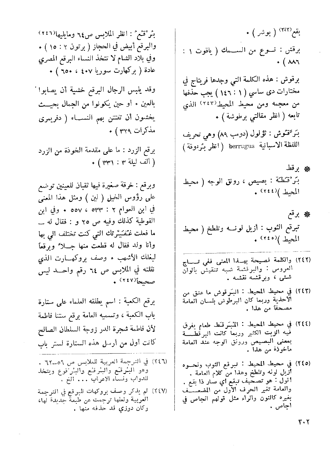 برقوش: هذه الكلمة التي وجدها فريتاج في مختارات دى ساسي (1: 146) يجب حذفها من معجمه ومن محيط المحيط الذي تابعه (انظر مقالتي برطوشة).