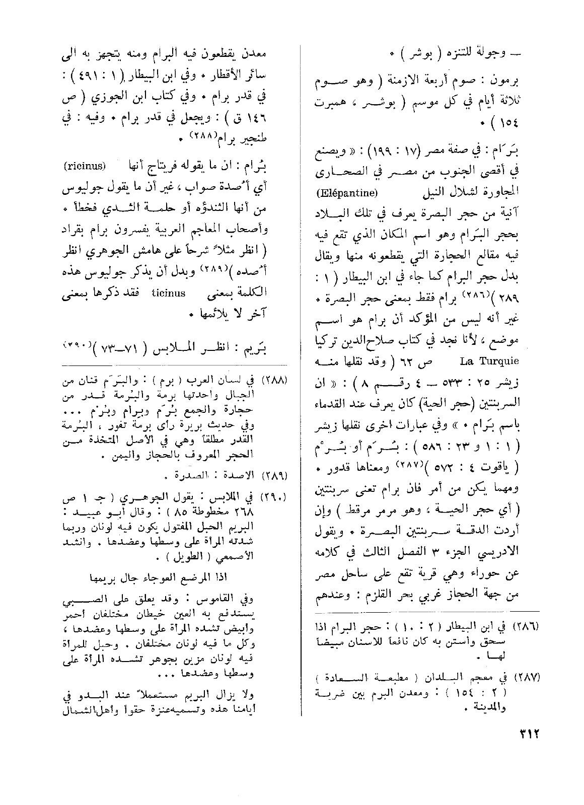 بَرَام: في صفة مصر (17: 199): ((ويصنع في أقصى الجنوب من مصر في الصحارى المجاورة لشلال النيل ( Elépantine) آنية من حجر البصرة يعرف في تلك البلاد بحجر البَرام وهو اسم المكان الذي تقع فيه مقالع الحجارة التي يقطعونه منها ويقال بدل حجر البرام كما جاء في ابن البيطار (1: 289) برام فقط بمعنى حجر البصرة. غير إنه ليس من المؤكد أن برام هو اسم موضع، لأنا نجد في كتاب صلاح الدين تركيا La Turquie ص62 (وقد نقلها منه زيشر 25: 533 - 4 رقم 8): ((إن السربنتين (حجر الحية) كان يعرف عند القدماء باسم بَرام.)) وفي عبارات أخرى نقلها زيشر (1: 1 و23: 586): بُرَم أو بُرْم (ياقوت 4: 572) ومعناها قدور. ومهما يكن من أمر فان برام تعني سربنتين (أي حجر الحية، وهو مرمر فقط) وإن أردت الدقة سربنتين البصرة. ويقول الادريسي الجزء 3 الفصل الثالث في كلامه عن حوراء وهي قرية تقع على ساحل مصر من جهة الحجاز غربي بحر القلزم: وعندهم معدن يقطعون فيه البرام ومنه يتجهز به إلى سائر الأقطار. وفي ابن البيطار (1: 491). في قدر برام. وفي كتاب ابن الجوزي (ص146 ق): ويجعل في قدر برام. وفيه: في طنجير برام.