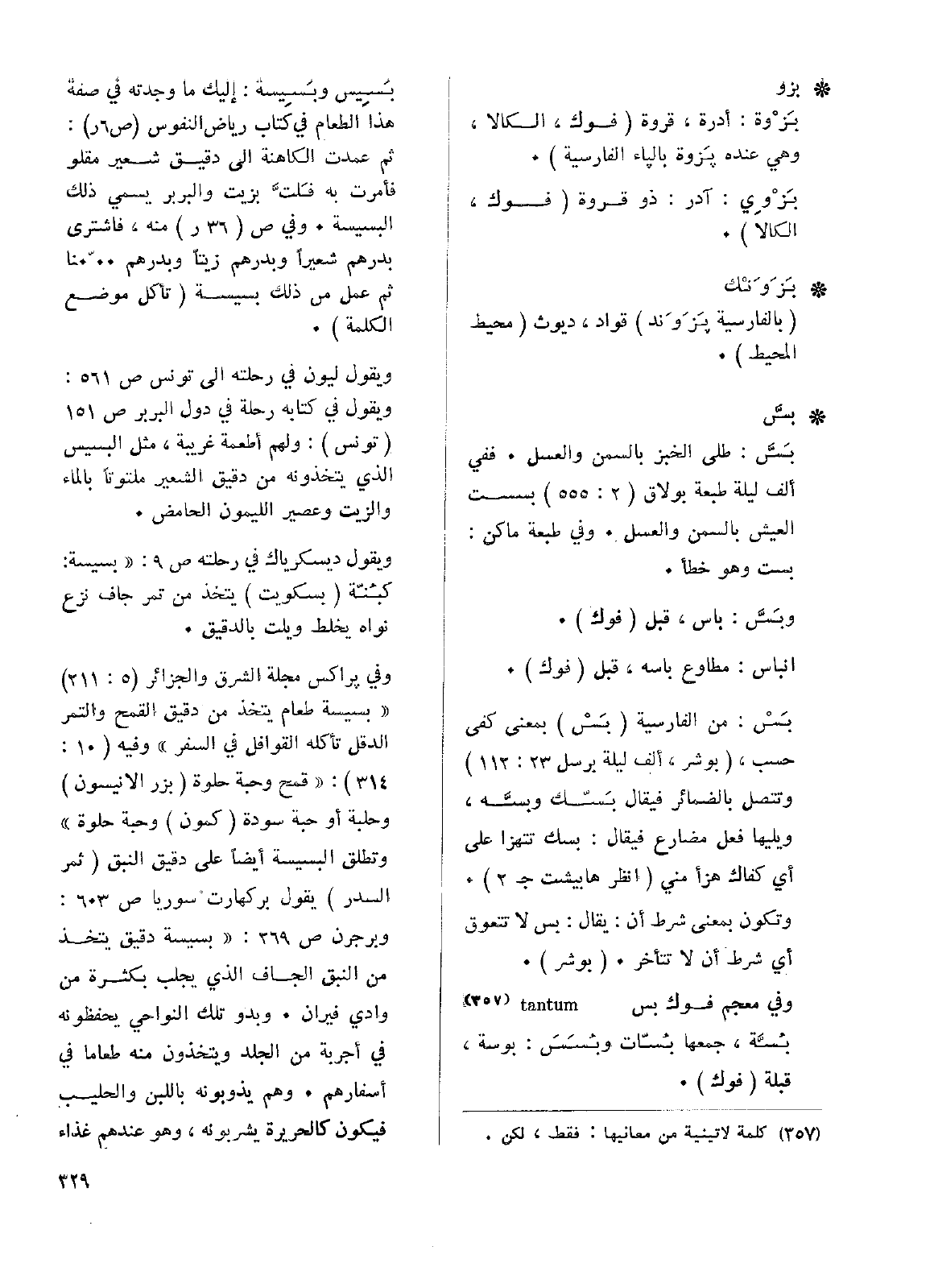 بَسِيس وبَسِيسة: إليك ما وجدته في صفة هذا الطعام في كتاب رياض النفوس (ص 6ر): ثم عمدت الكاهنة إلى دقيق شعير مقلو فأمرت به فَلتَّ بزيت والبربر يسمي ذلك البسيسة. وفي ص (36ر) منه، فاشترى بدرهم شعيراً وبدرهم زيتاً وبدرهم .. ّ. نا ثم عمل من ذلك بسيسة (تأكل موضع الكلمة).