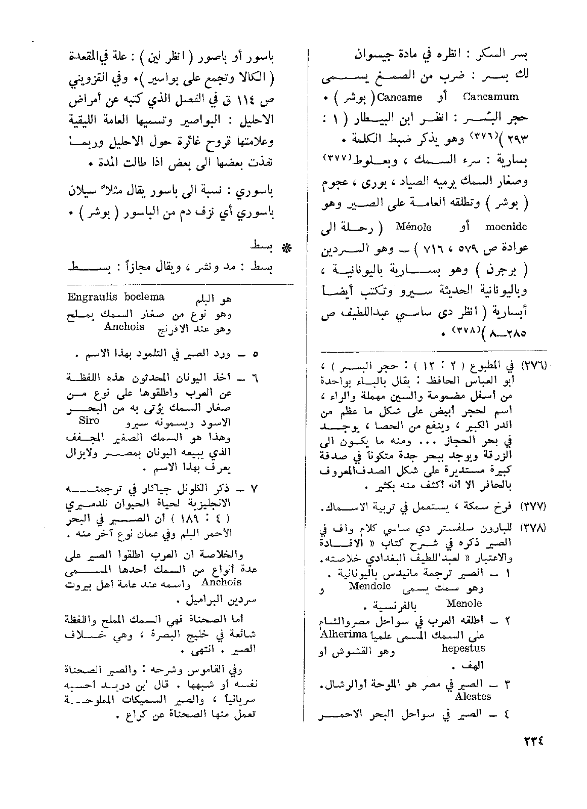 بسارية: سرء السمك، وبعلوط وصغار السمك يرميه الصياد، بوري، عجوم (بوشر) وتطلقه العامة على الصير وهو moenide أو Ménole ( رحلة إلى عوادة ص579، 716) - وهو السردين (برجرن) وهو بسارية باليونانية، وباليونانية الحديثة سيرو وتكتب أيضاً أبسارية (انظر دي ساسي عبد اللطيف ص285 - 8).