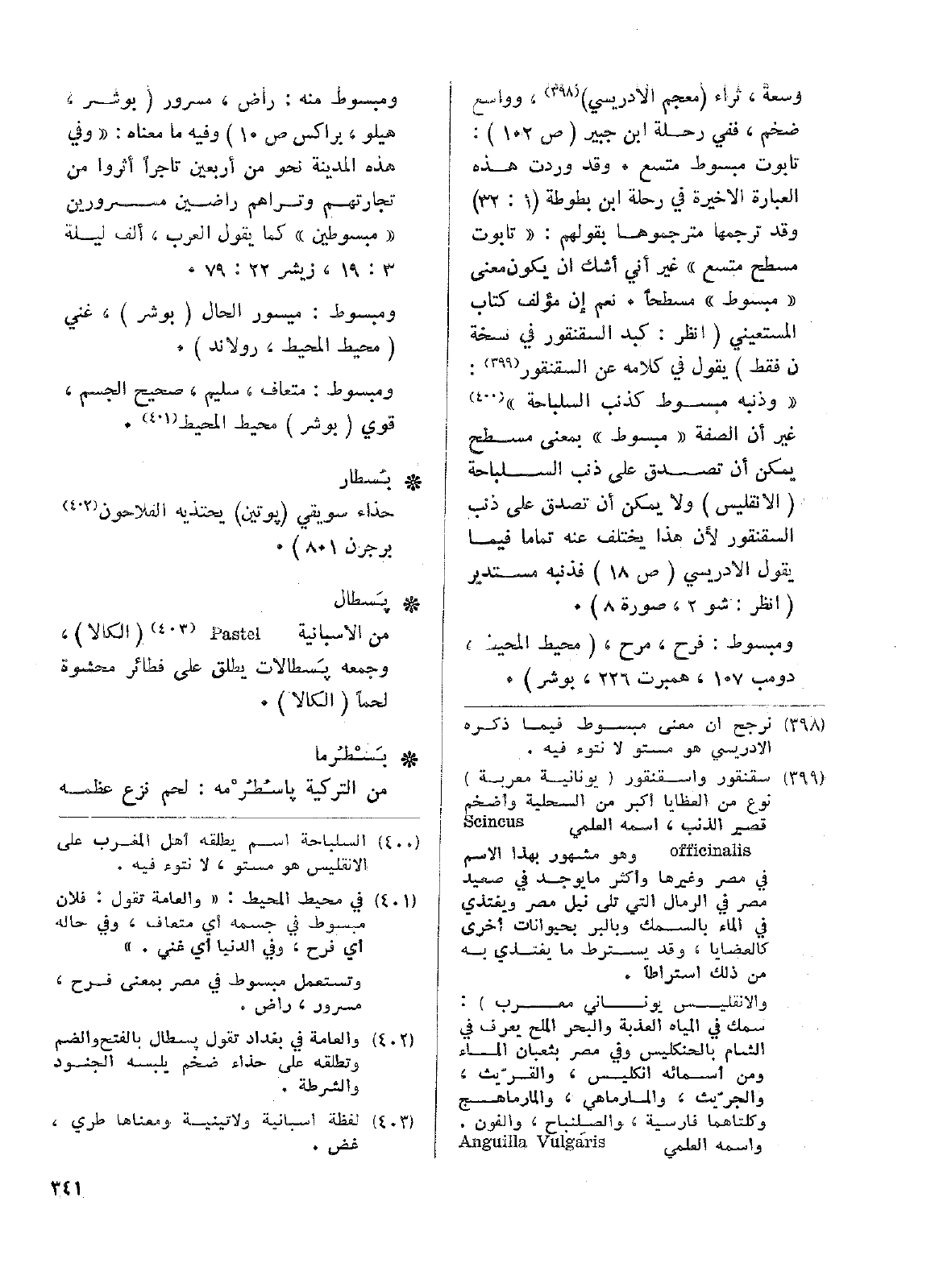 وسعة، ثراء (معجم الادريسي)، وواسع ضخم، ففي رحلة ابن جبير (ص102): تابوت مبسوط متسع. وقد وردت هذه العبارة الأخيرة في رحلة ابن بطوطة (1: 32) وقد ترجمها مترجموها بقولهم: ((تابوت مسطح متسع)) غير أني أشك أن يكون معنى ((مبسوط)) مسطحاً. نعم إن مؤلف كتاب المستعيني (انظر: كبد السقنقور في نسخة ن فقط) يقول في كلامه عن السقنقور: ((وذنبه مبسوط كذنب السلباحة)) غير أن الصفة ((مبسوط)) بمعنى مسطح يمكن أن تصدق على ذنب السلباحة (الانقليس) ولا يمكن أن تصدق على ذنب السقنقور لأن هذا يختلف عنه تماما فيما يقول الادريسي (ص18) فذنبه مستدير (انظر: شو2، صورة 8).