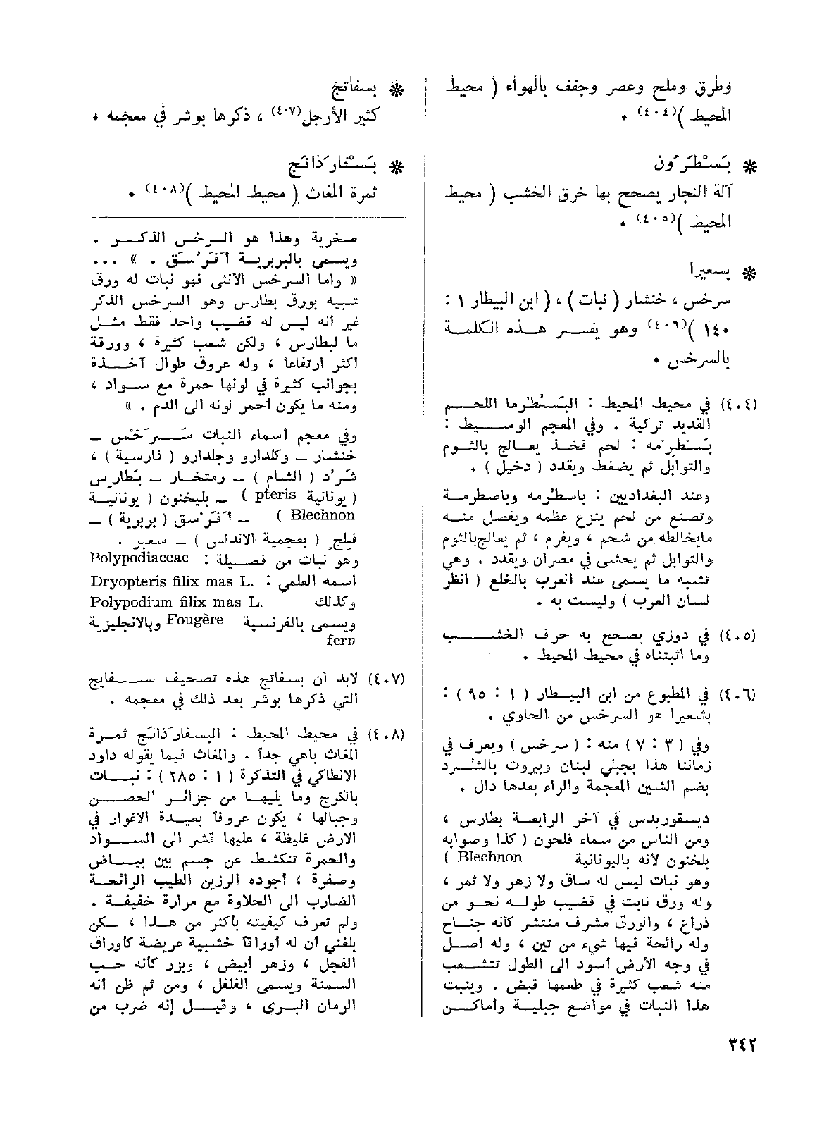 • بسعيرا: سرخس، خنشار (نبات) (ابن البيطار 1: 140) وهو يفسر هذه الكلمة بالسرخس.