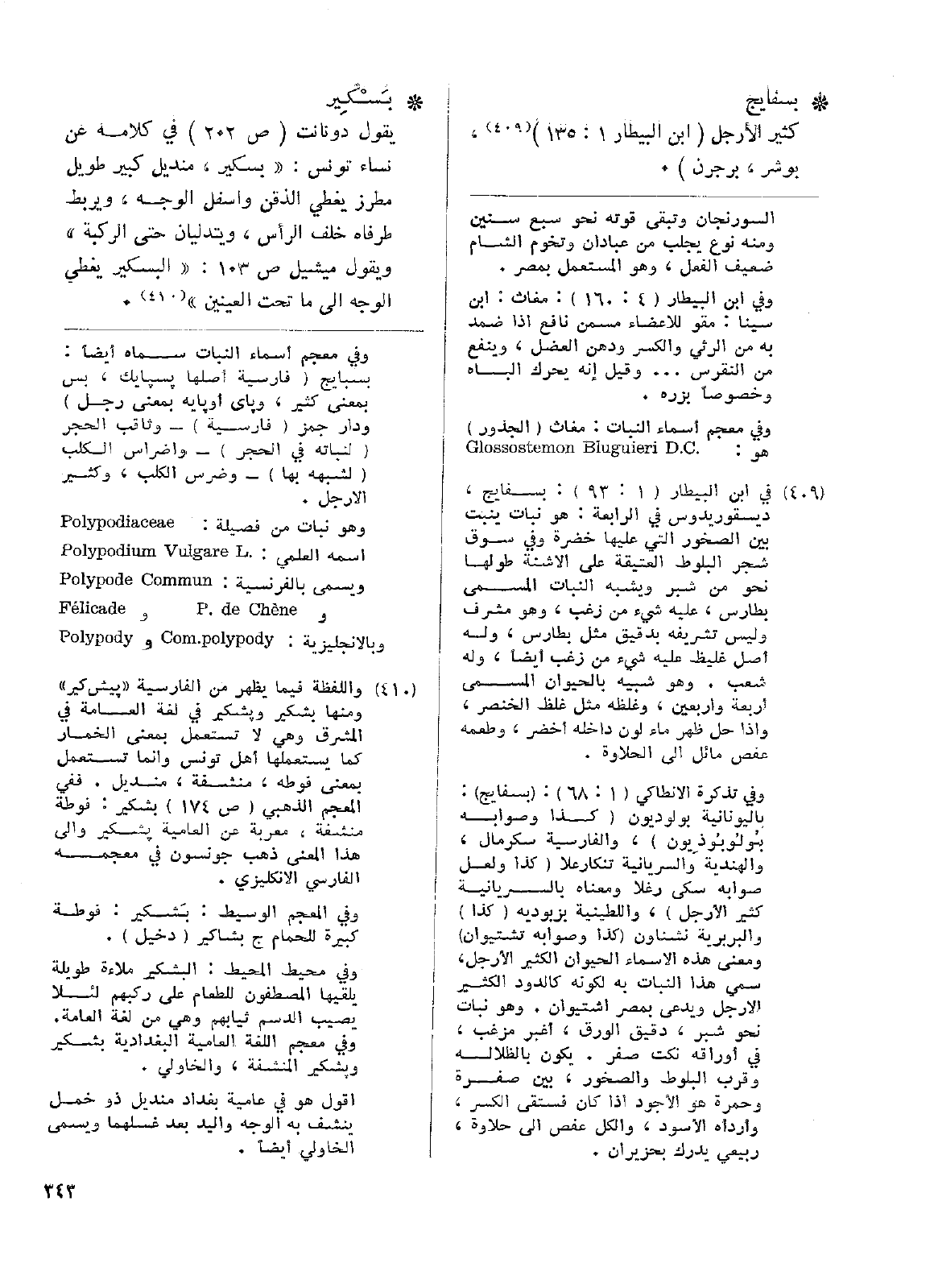 • بسفايج: كثير الأرجل (ابن البيطار 1: 135)، بوشر، برجرن).