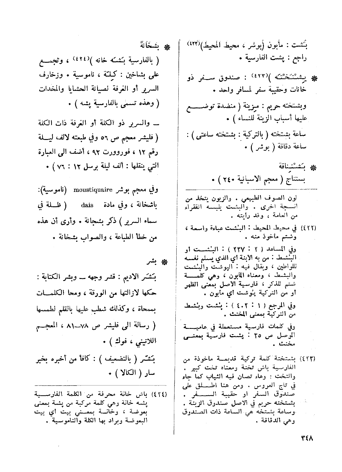 • بشخانة: (بالفارسية بَشَه خانه)، وتجمع على بشاخين: كِلّة، ناموسية. وزخارف السرير أو الغرفة لصيانة الحشايا والمخدات (وهذه تسمى بالفارسية بشه).