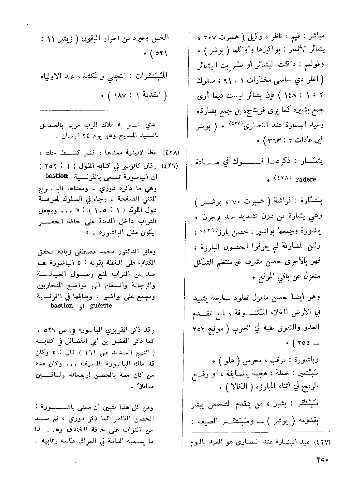 مباشر: قيم، ناظر، وكيل (همبرت 207، بشائر الأثمار: بواكيرها وأوائلها (بوشر). وقولهم: دُقَّت البشائر أو ضُرِبت البشائر (انظر دي ساسي مختارات 1: 91، مملوك 2، 1: 148) فإن بشائر ليست فيما أرى جمع بشيرة كما يرى فريتاج، بل جمع بشارة. وعيد البشارة عند النصارى. (بوشر لين عادات 2: 363).