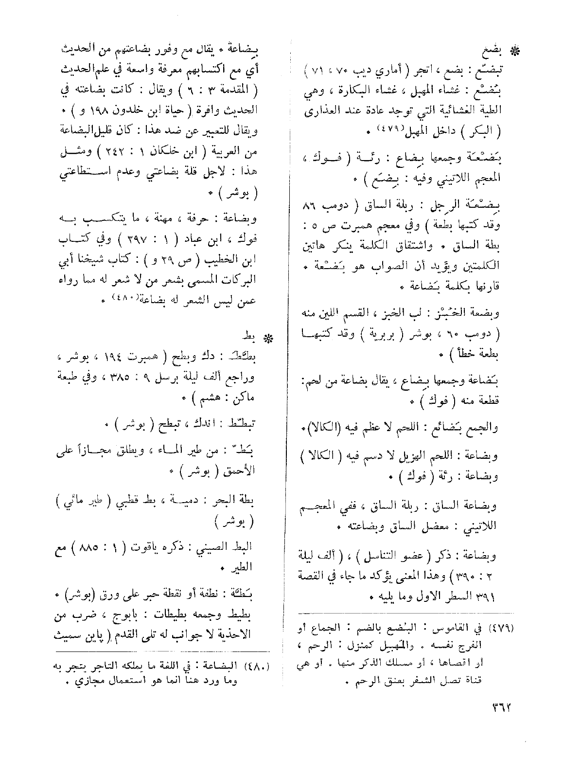 بِضْعَة الرِجل: ربلة الساق (دومب 86 وقد كتبها بطعة) وفي معجم همبرت ص5: بطة الساق. واشتقاق الكلمة ينكر هاتين الكلمتين ويؤيد أن الصواب هو بَضْعة. قارنها بكلمة بَضاعة.