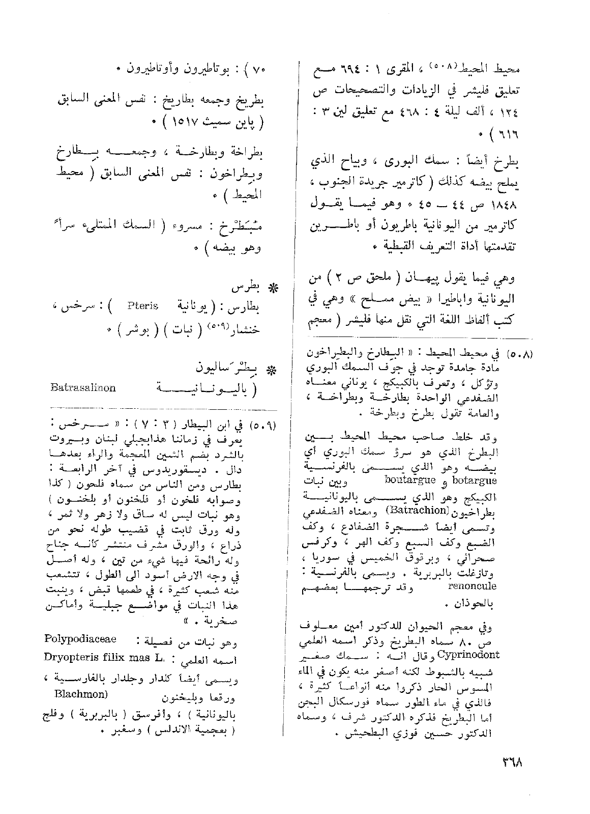 بطرخ أيضاً: سمك البوري، وبياح الذي يملح بيضه كذلك (كاترمير جريدة الجنوب، 1848 ص44 - 45. وهو فيما يقول كاترمير من اليونانية باطريون أو باطرين تقدمتها أداة التعري القبطية.