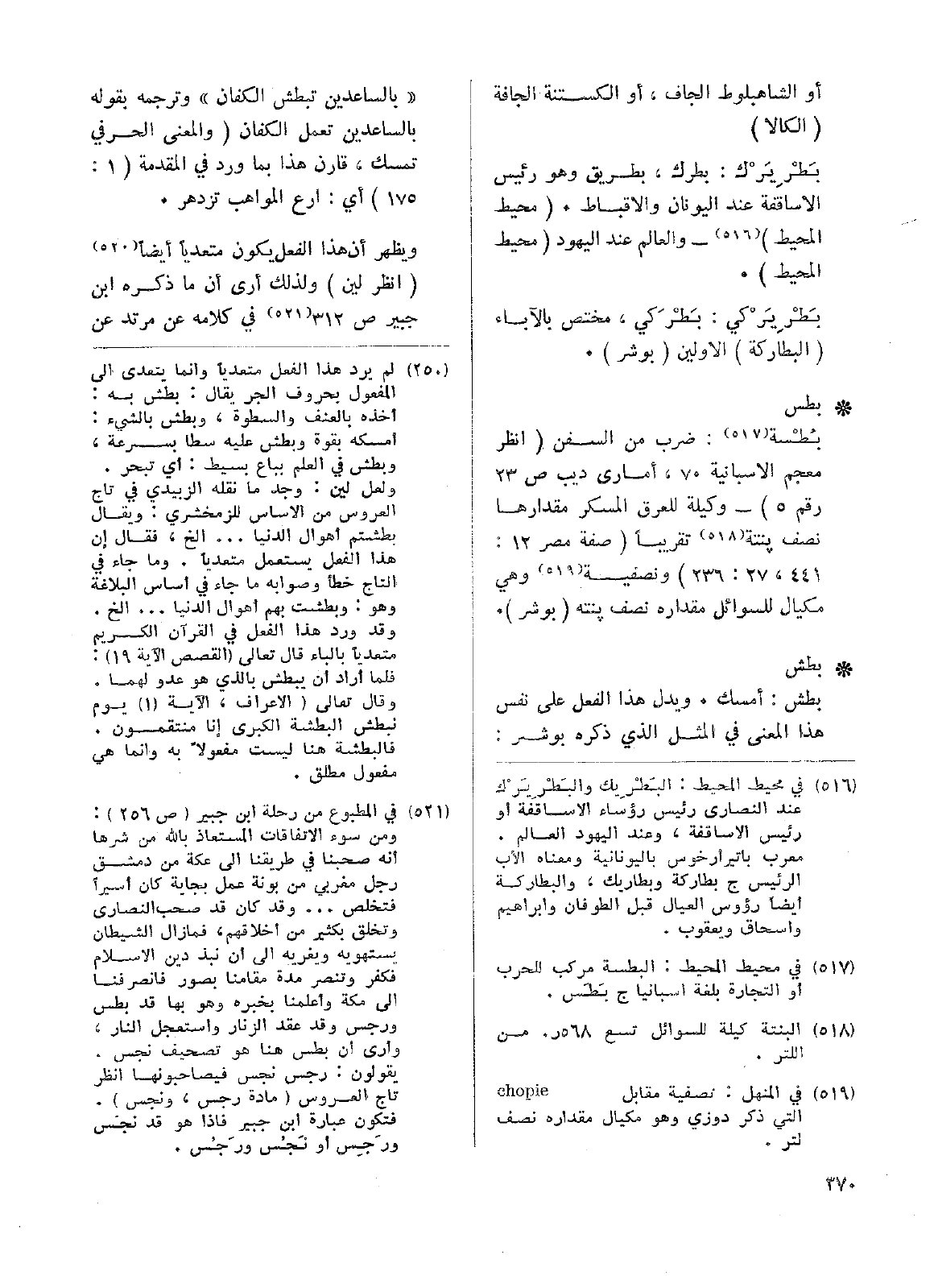 • بطش: بطش: أمسك. ويدل هذا الفعل على نفس هذا المعنى في المثل الذي ذكره بوشر: ((بالساعدين تبطش الكفان)) وترجمه بقوله بالساعدين تعمل الكفان (والمعنى الحرفي تمسك، قارن هذا بما ورد في المقدمة (1: 175) أي: ارع المواهب تزدهر.