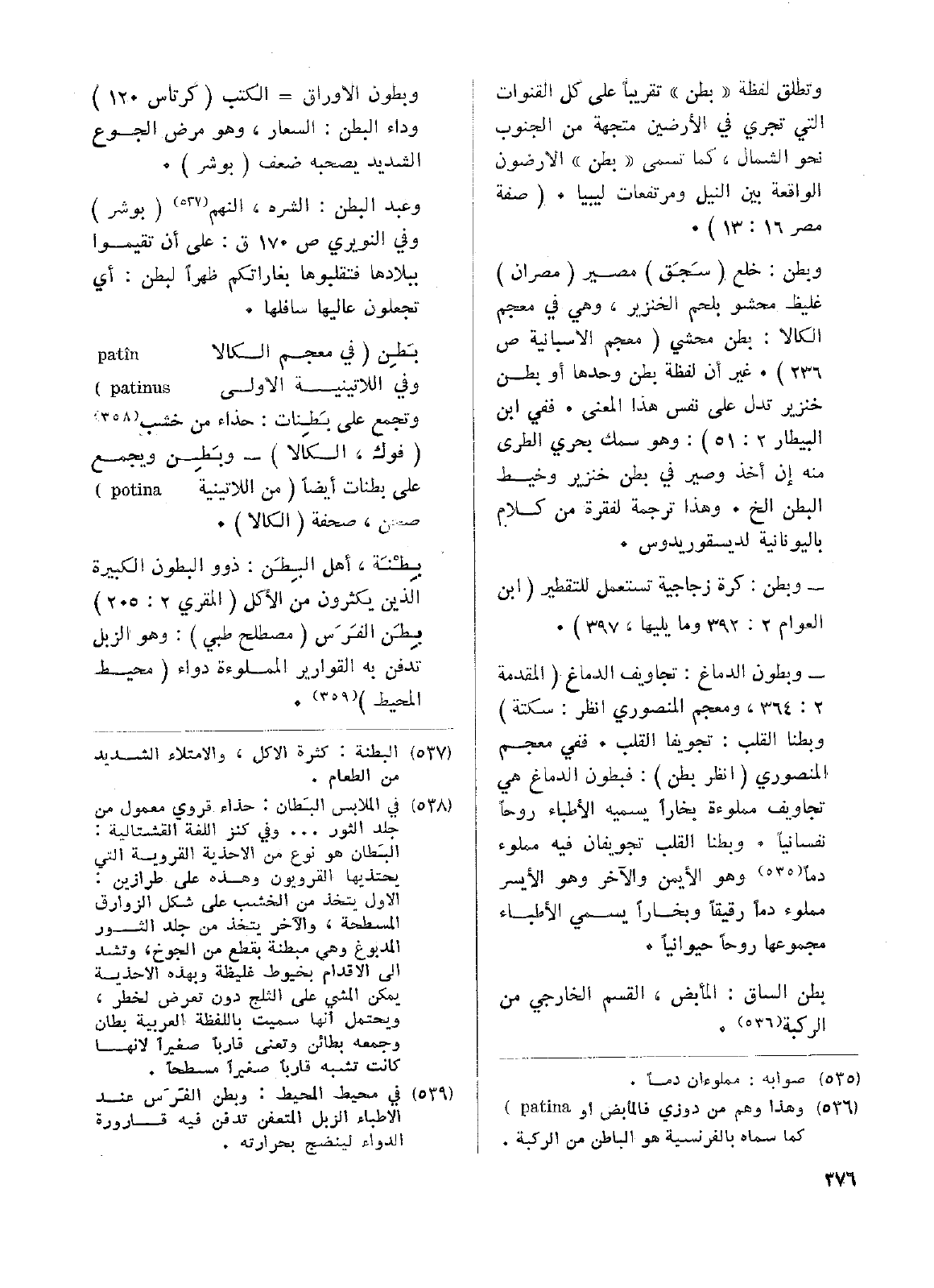 بَطِن (في معجم الكالا patîn وفي اللاتينية الاولى patinus) وتجمع على بَطِنات: حذاء من خشب (فوك، الكالا) - وبَطِن ويجمع على بطنات أيضاً (من اللاتينية potina) صحن، صحفة (الكالا).