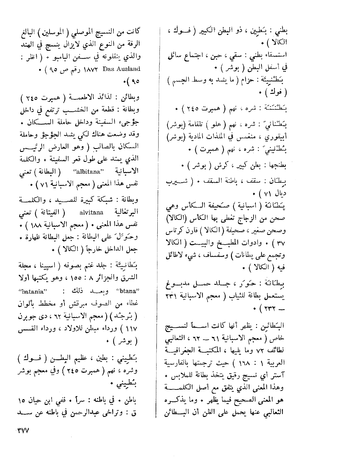 بِطَانَة: حَوَر، جلد حمل مدبوغ يستعمل بطانة للثياب (معجم الأسبانية 231 - 232) البَطائِن: يظهر أنها كانت اسماً لنسيج خاص (معجم الأسبانية 61 - 62، الثعالبي لطائف 72 وما يليها، المكتبة الجغرافية العربية 1: 168) حيث ترجمتها بالفارسية آستر أي نسيج رقيق يتخذ بطانة للملابس. وهذا المعنى الذي يتفق مع أصل الكلمة هو المعنى الصحيح فيما يظهر. وما يذكره الثعالبي عنها يحمل على الظن أن البطائن كانت من النسيج الموصلي (الموسلين) البالغ الرقة من النوع الذي لا يزال ينسج في الهند والذي ينقلونه في سفن البامبو. (انظر: Das Ausland 1872 رقم ص95).