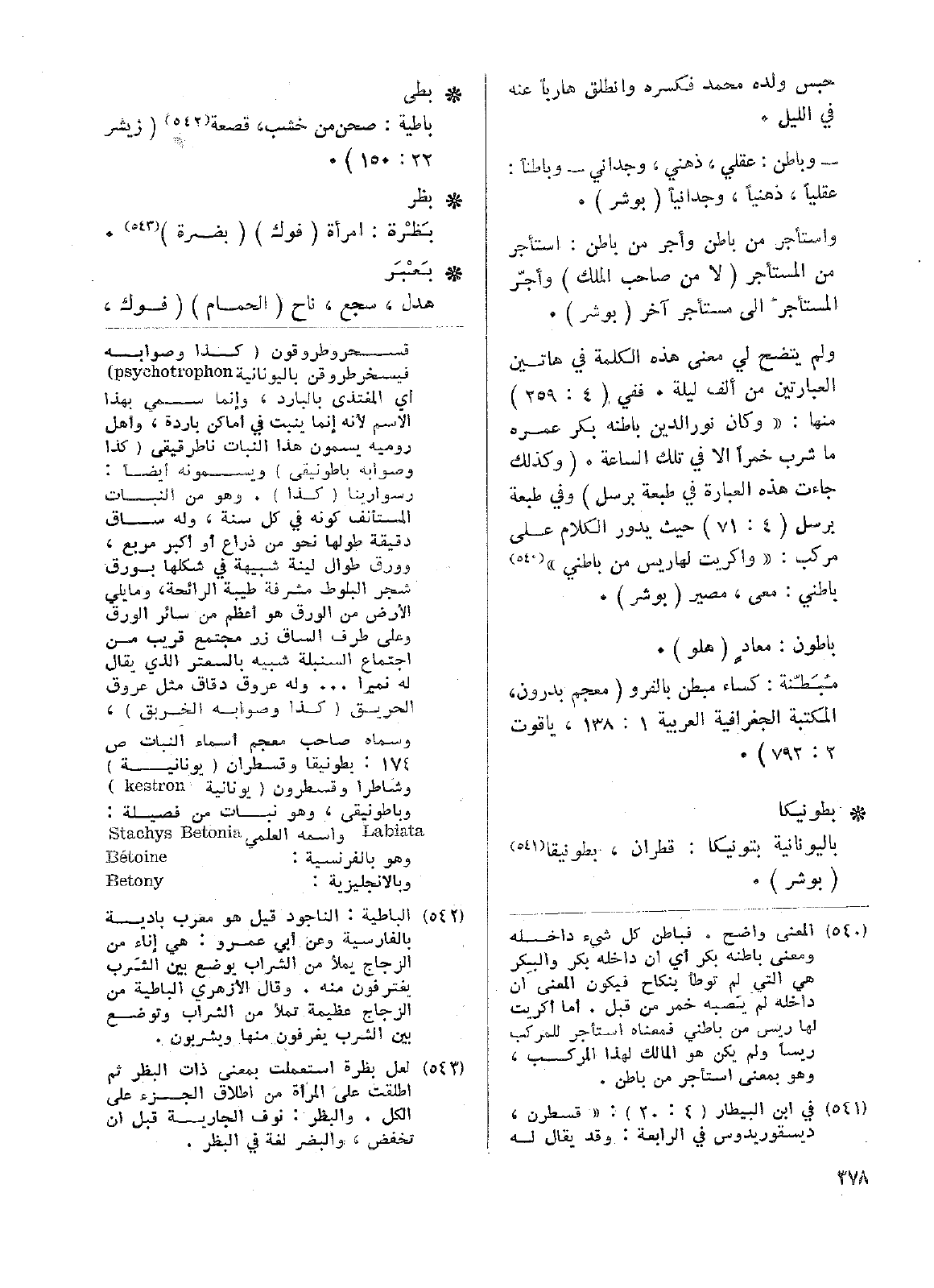 ولم يتضح لي معنى هذه الكلمة في هاتين العبارتين من ألف ليلة. ففي (4: 259) منها: ((وكان نور الدين باطنه بكر عمره ما شرب خمراً إلا في تلك الساعة. (وكذلك جاءت هذه العبارة في طبعة برسل) وفي طبعة برسل (4: 71) حيث يدور الكلام على مركب: ((وأكريت لها ريس من باطني)) باطني: معي، مصير (بوشر).
