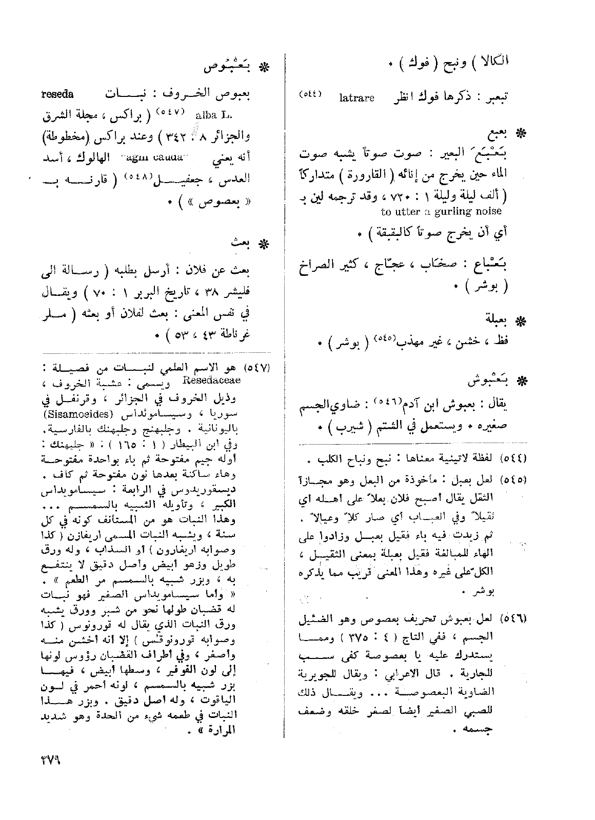 • بَعْبُوص: بعبوص الخروف: نبات reseda alba L. ( براكس، مجلة الشرق والجزائر 8: 342) وعند براكس (مخطوطة) إنه يعني " agm eauda" الهالوك، أسد العدس، جعفيل (قارنه ب ((بعصوص))).