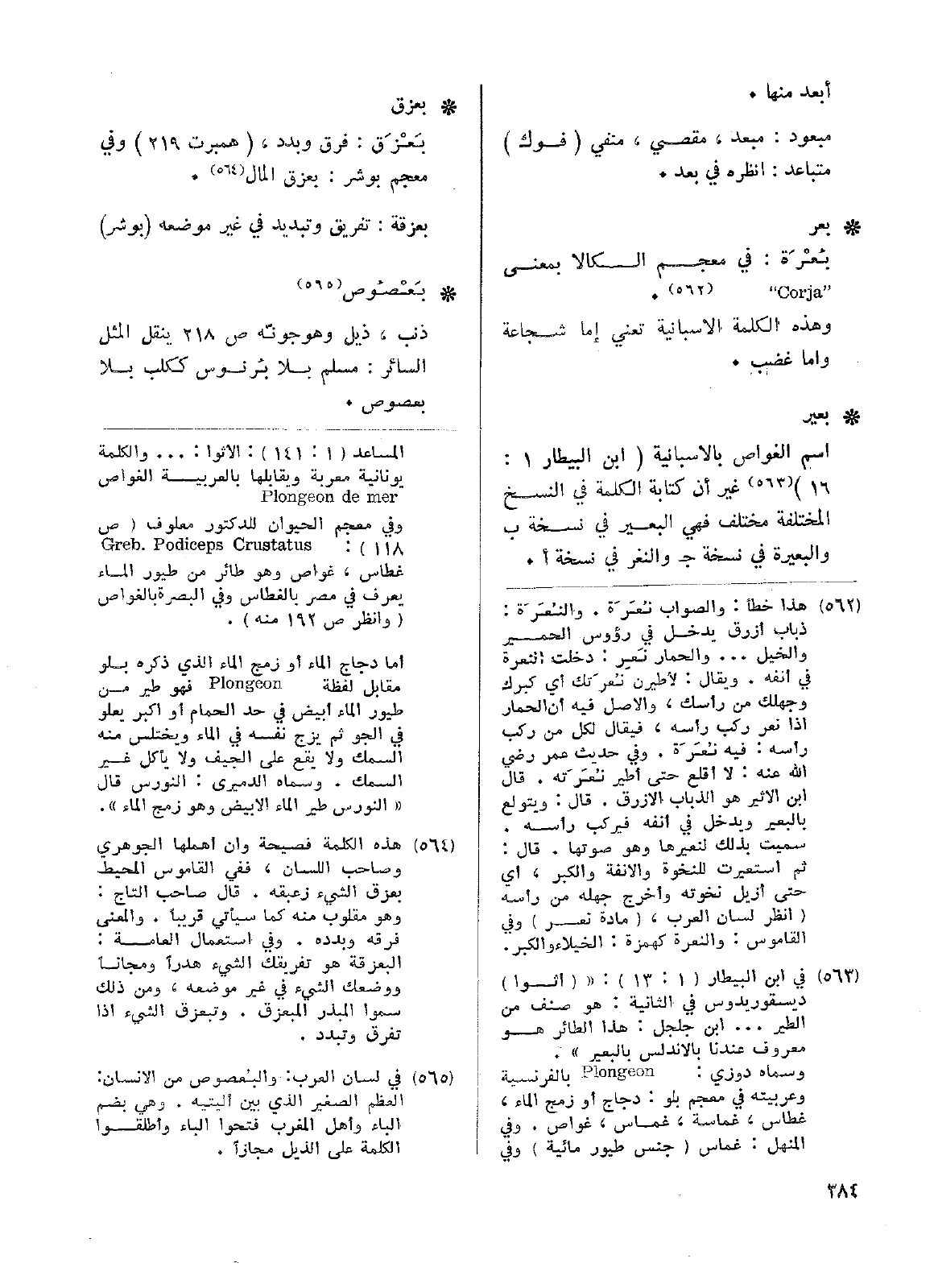 • بعير: اسم الغواص بالأسبانية (ابن البيطار 1: 16 غير أن كتابة الكلمة في النسخ المختلفة مختلف فهي البعير في نسخة ب والبعيرة في نسخة ج والنغر في نسخة أ.