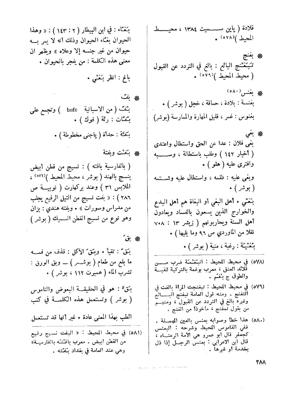 • بُفْت وبفتة: (بالفارسية بافته): نسيج من قطن أبيض ينسج بالهند (بوشر، محيط المحيط)، الملابس 31) وعند بركهارت (نوبية ص286): ((بفت نسيج من التيل الرفيع يجلب من مدارس وسورات)). وبفته هندي: بزان وهو نوع من نسيج القطن السميك (بوشر).