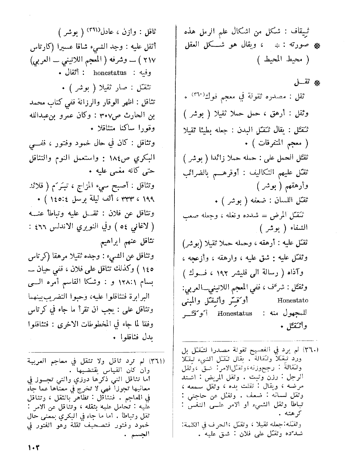 وثقّل عليه: شق عليه، وأرهقه، وأزعجه، وآذاه (رسالة إلى فليشر 192، فوك) وثقَّل: شرَّف، ففي المعجم اللاتيني- العربي: Honestato أو قَرِّ وأثِقّل والمبنى للمجهول منه: Honestatus أُوَقَّر وأثَقَّل.