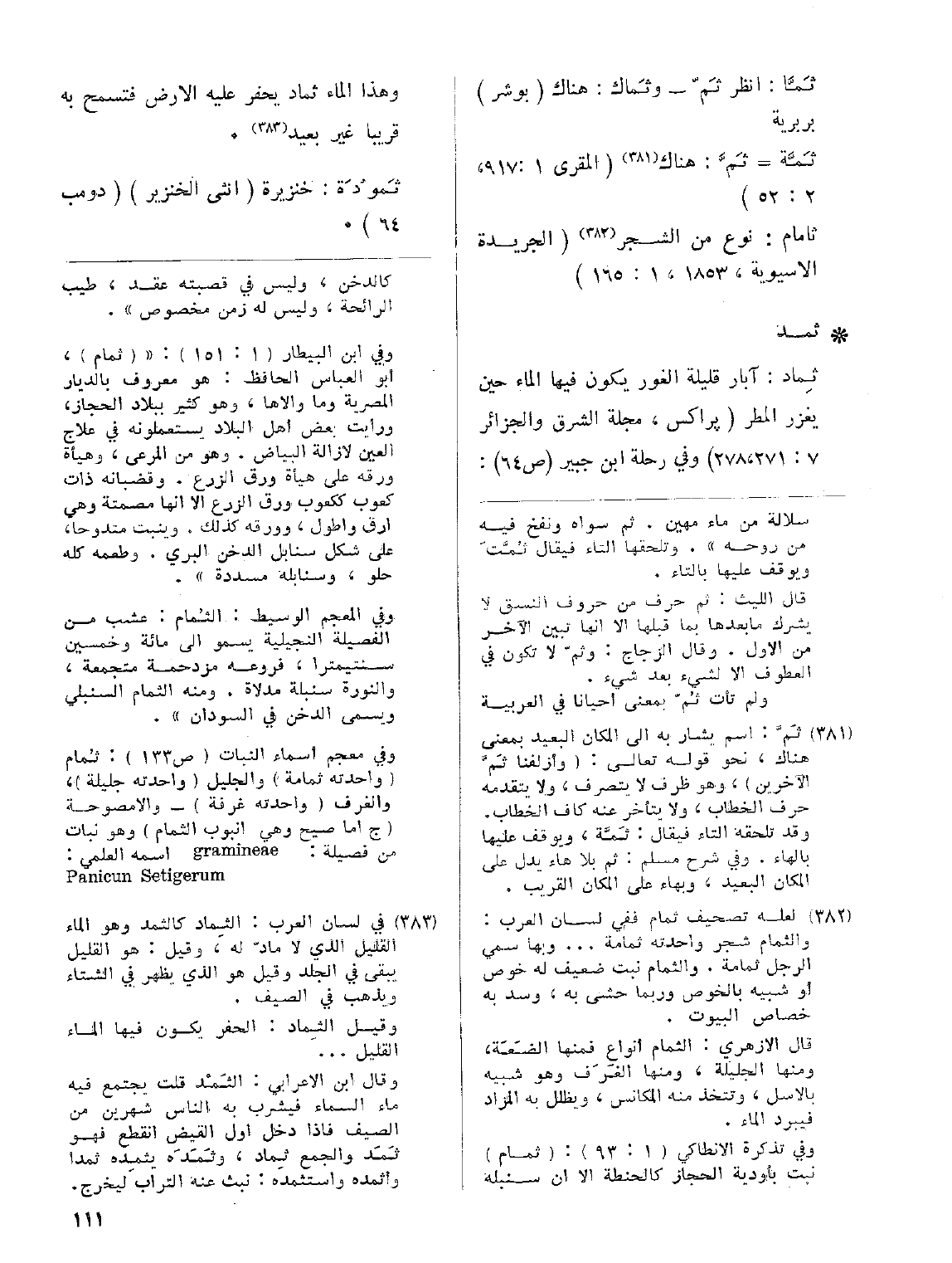 ثَمَّا: انظر ثَمّ - وثَماك: هناك (بوشر) بربرية ثَمَّة= ثَمَّ: هناك (المقري 1: 917، 2: 52) ثامام: نوع من الشجر (الجريدة الآسيوية، 1853، 1: 165)