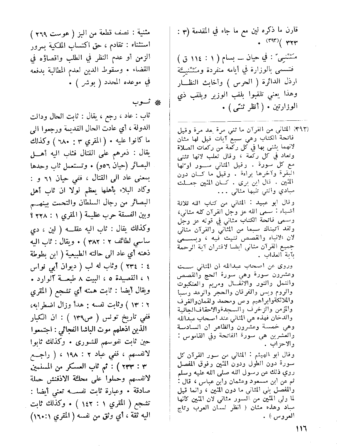 • ثوب: ثاب: عاد، رجع: يقال: ثابت الحال ودالت الدولة، أي عادت الحال القديمة ورجعوا إلى ما كانوا عليه. (المقري 3: 680) وكذلك يقال: ذمرهم على القتال فثاب إليه أهل البصائر (حيان 56و). وتستعمل ثاب وحدها بمعنى عاد إلى القتال، ففي حيان 61و: وكاد البلاء بأهلها يعظم لولا أن ثاب أهل البصائر من رجال السلطان والتحست بينهم وبين الفسقة حرب عظيمة (المقري 1: 228؟ وكذلك يقال: ثاب إليه عقله (لين، دي ساسي لطائف 2: 382). ويقال: ثاب إليه ذهنه أي عاد إلى حالته الطبيعية (ابن بطوطة 4: 234) وثاب له (ديوان أبي نواس 1، القصيدة 5، البيت 8 طبعة آلوارد. ويقال أيضاً: ثابت همته أي تشجع (المقري 2: 13) وثابت نفسه: هدأ وزال اضطرابه، ففي تاريخ تونس (ص 139): إن الكبار الذين أذهلهم موت الباشا الفجائي: اجتمعوا حين ثابت نفوسهم للشورى. وكذلك ثابوا لانفسهم، ففي عباد 2: 198، (راجع 3: 233): ثم ثاب العسكر من المسلمين لأنفسهم وحملوا على محَّلة الاذفنش حملة صادقة. وعبارة ثابت نفسه تعني أيضاً: تشجع (المقري 1: 142). وكذلك ثابت إليه ثقة، أي وثق من نفسه (المقري 1: 160).