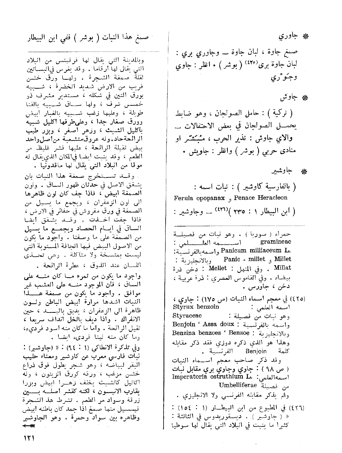 • جاوشير: (بالفارسية كاوشير) نبات اسمه: Ferula opopanax و Penace Heracleon ( ابن البيطار 1: 235) - وجاوشير: صمغ هذا النبات (بوشر) ففي ابن البيطار