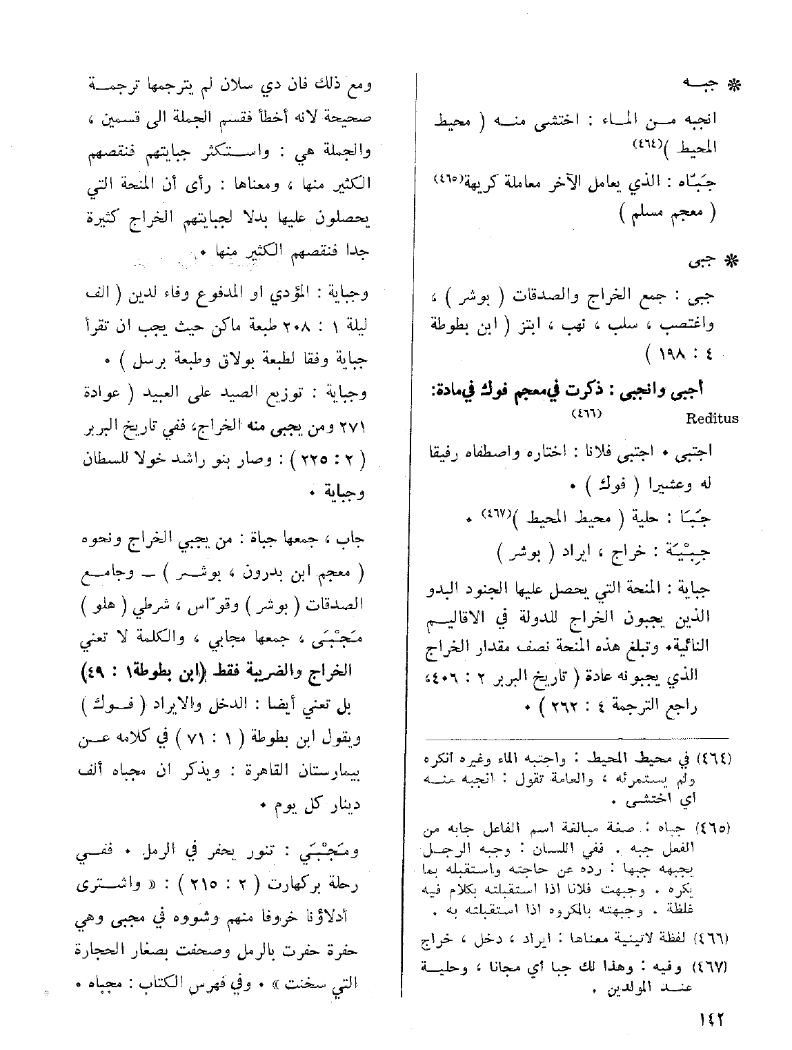 وجباية: المؤدي أو المدفوع وفاء لدين (ألف ليلة 1: 208 طبعة ماكن حيث يجب أن تقرأ جباية وفقا لطبعة بولاق وطبعة برسل).