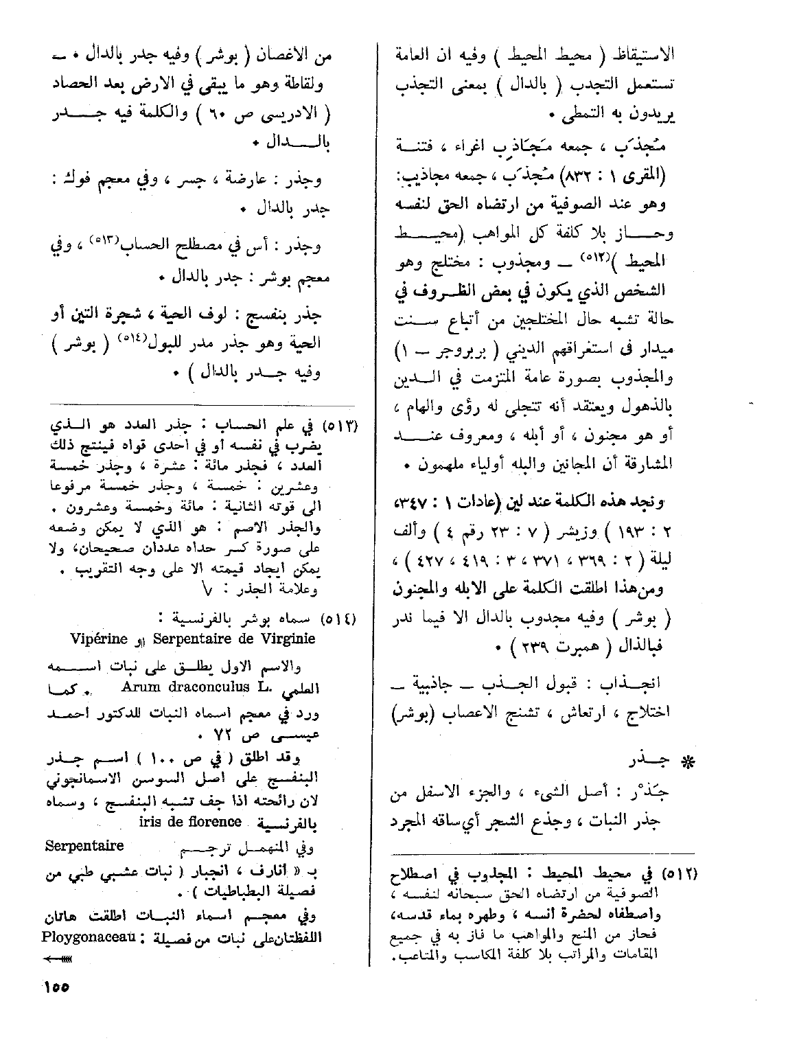 ونجد هذه الكلمة عند لين (عادات 1: 347، 2: 193) وزيشر (7: 23 رقم 4) وألف ليلة (2: 369، 371، 3: 419، 427)، ومن هذا أطلقت الكلمة على الأبله والمجنون (بوشر) وفيه مجدوب بالدال إلا فيما ندر فبالذال (همبرت 239).